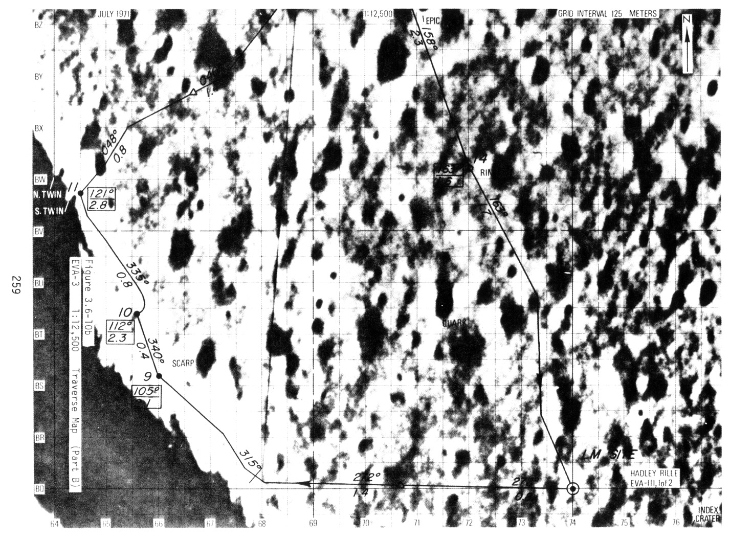 [They landed at a north-south coordinate of about BS.4. Because successive named grid lines - BS and BR, for example - are 250 meters apart, they landed about 2.4 grid units or 0.6 kilometers above the top of Jim's map. Consequently, they have not yet driven onto the map.]121:48:06 Allen: Roger, Jim...