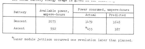 current was 74 amperes, during powered descent. Electrical power used during