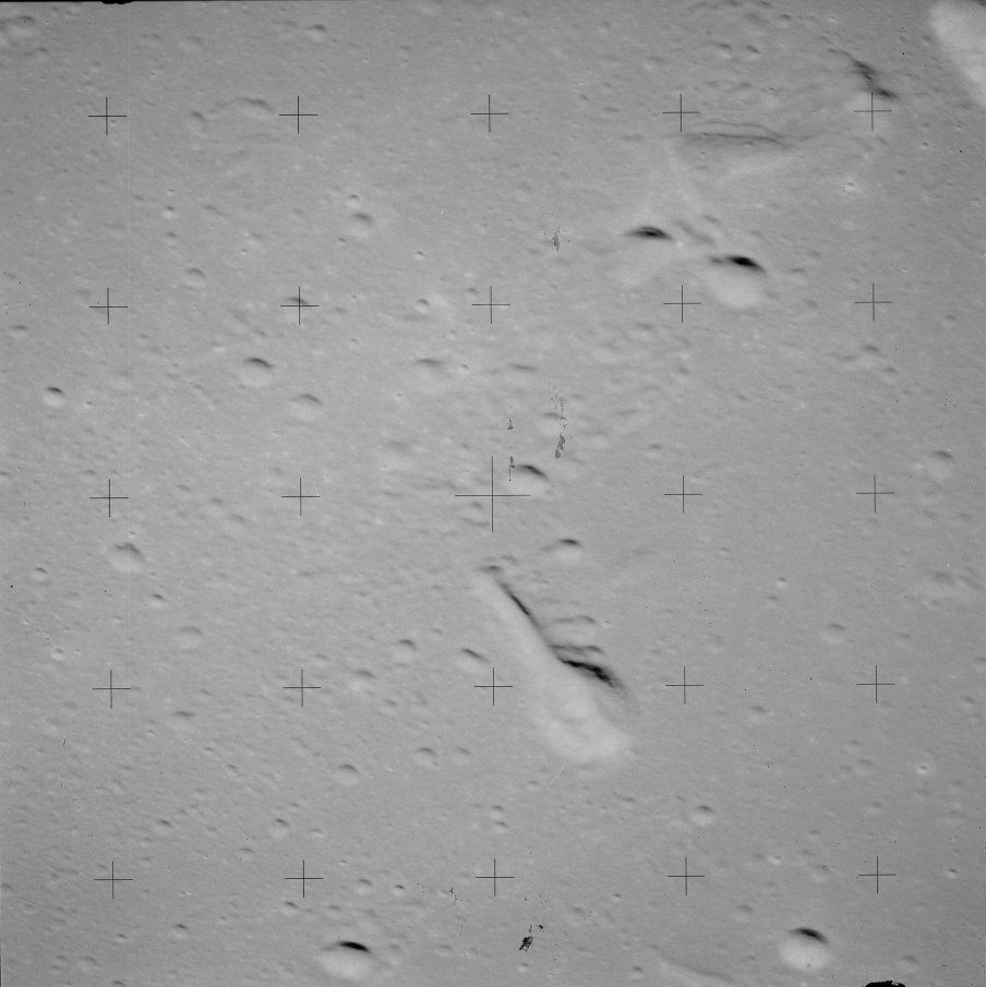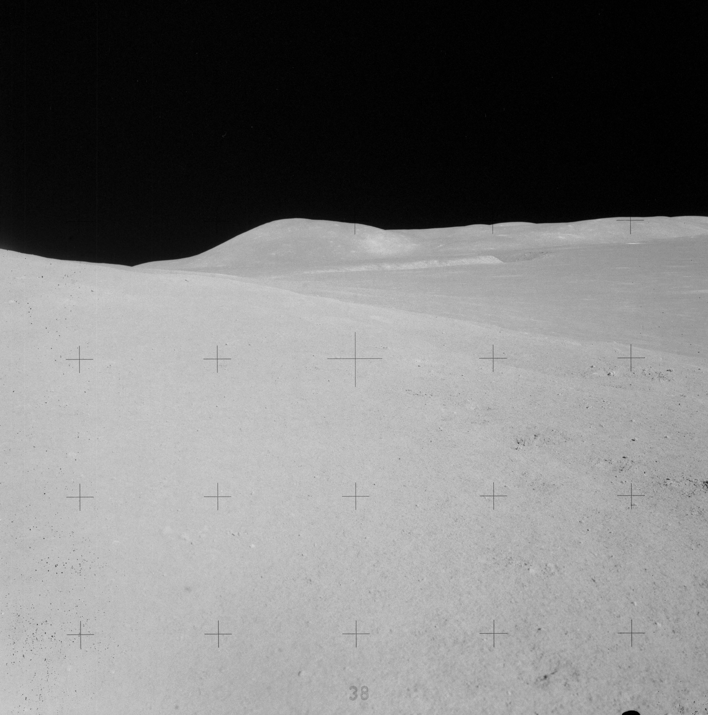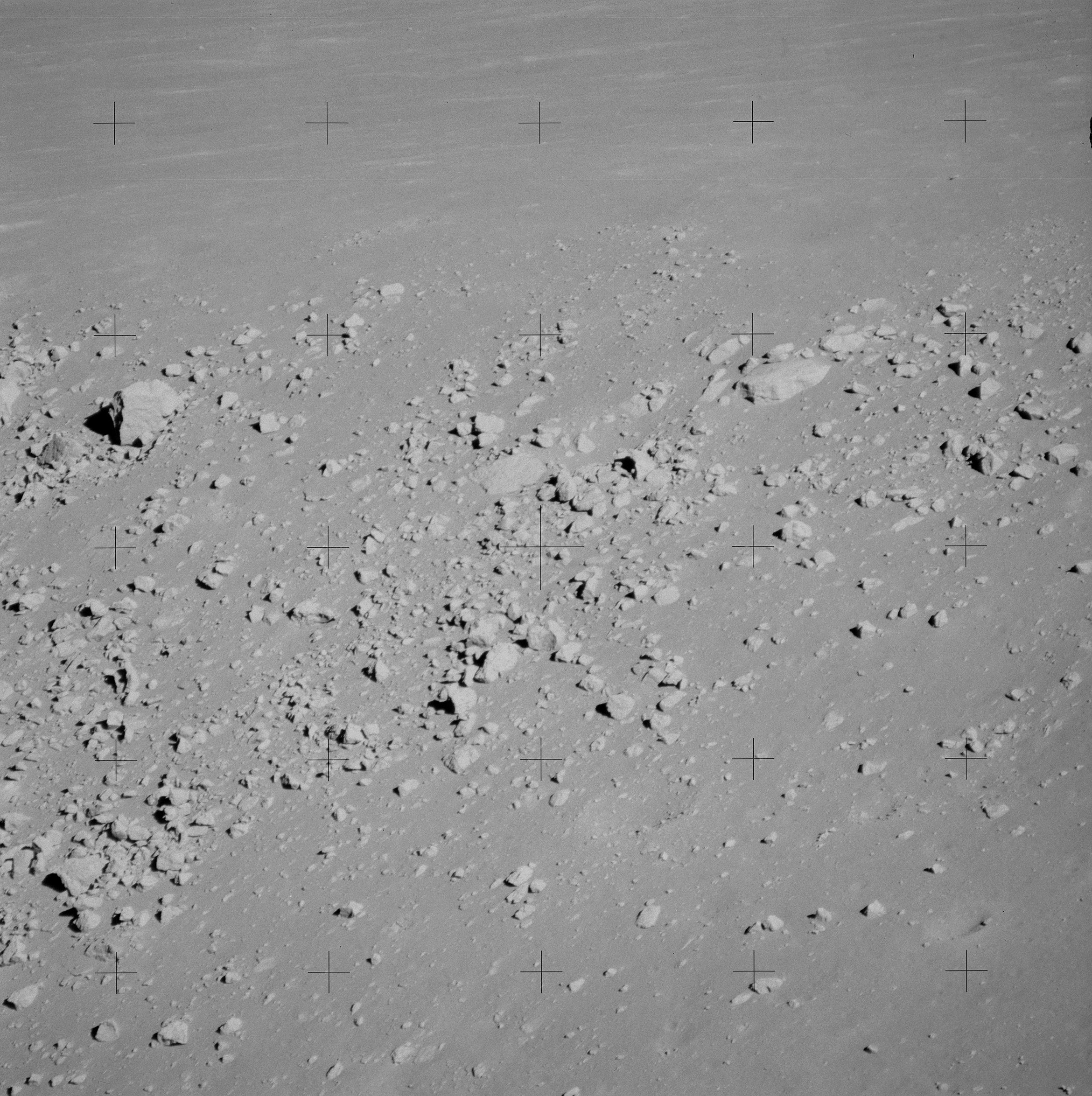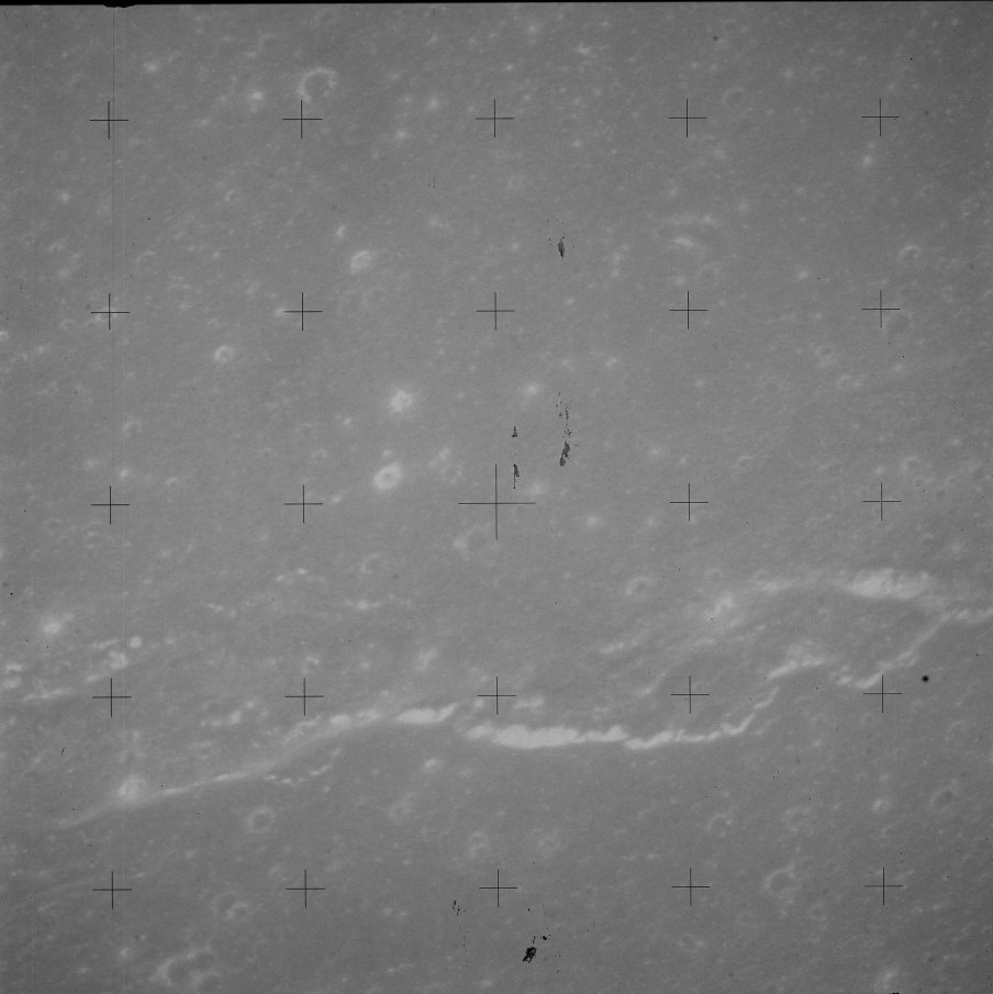 This picture was taken from the LM during CSM Rev 13 on the last pass over the landing site prior to the descent. A labeled version shows some of the prominent landmarks.Rev 16 Mapping (Metric) Camera Frame 0414 ( 13 Mb )