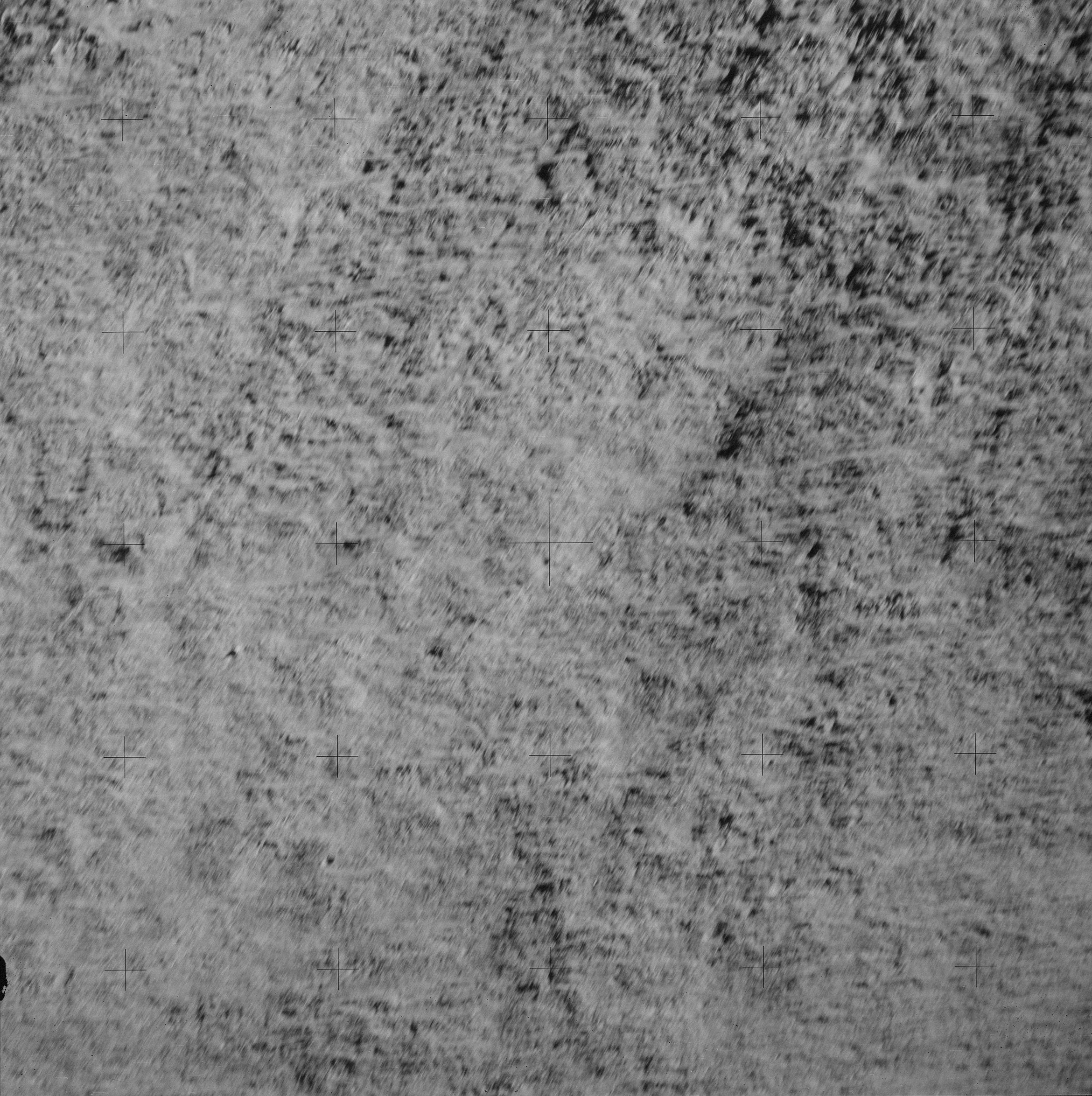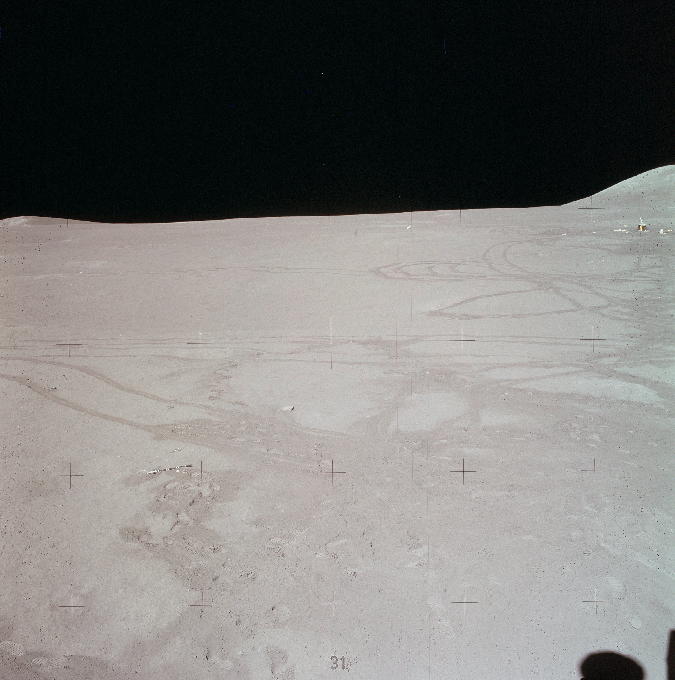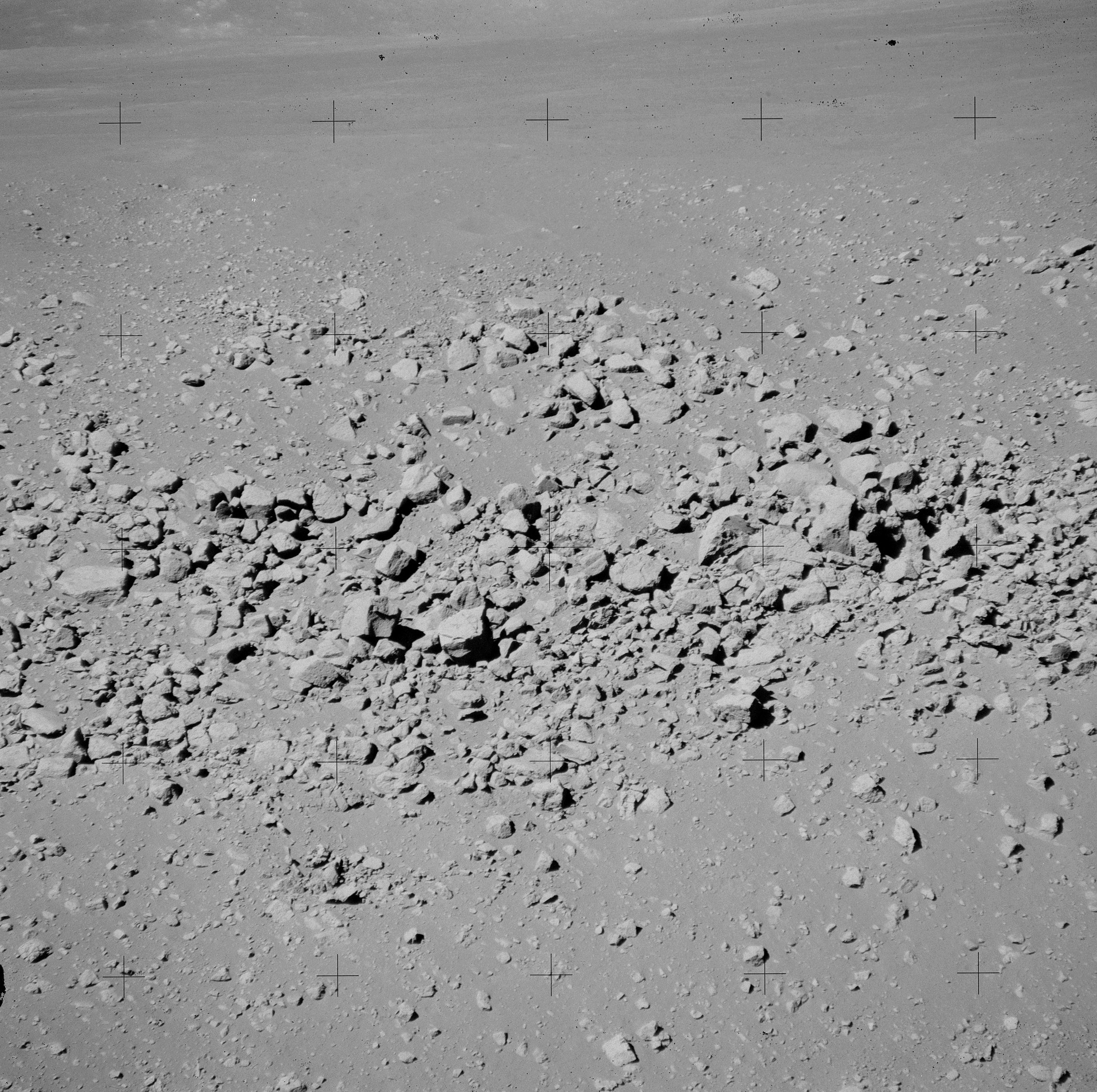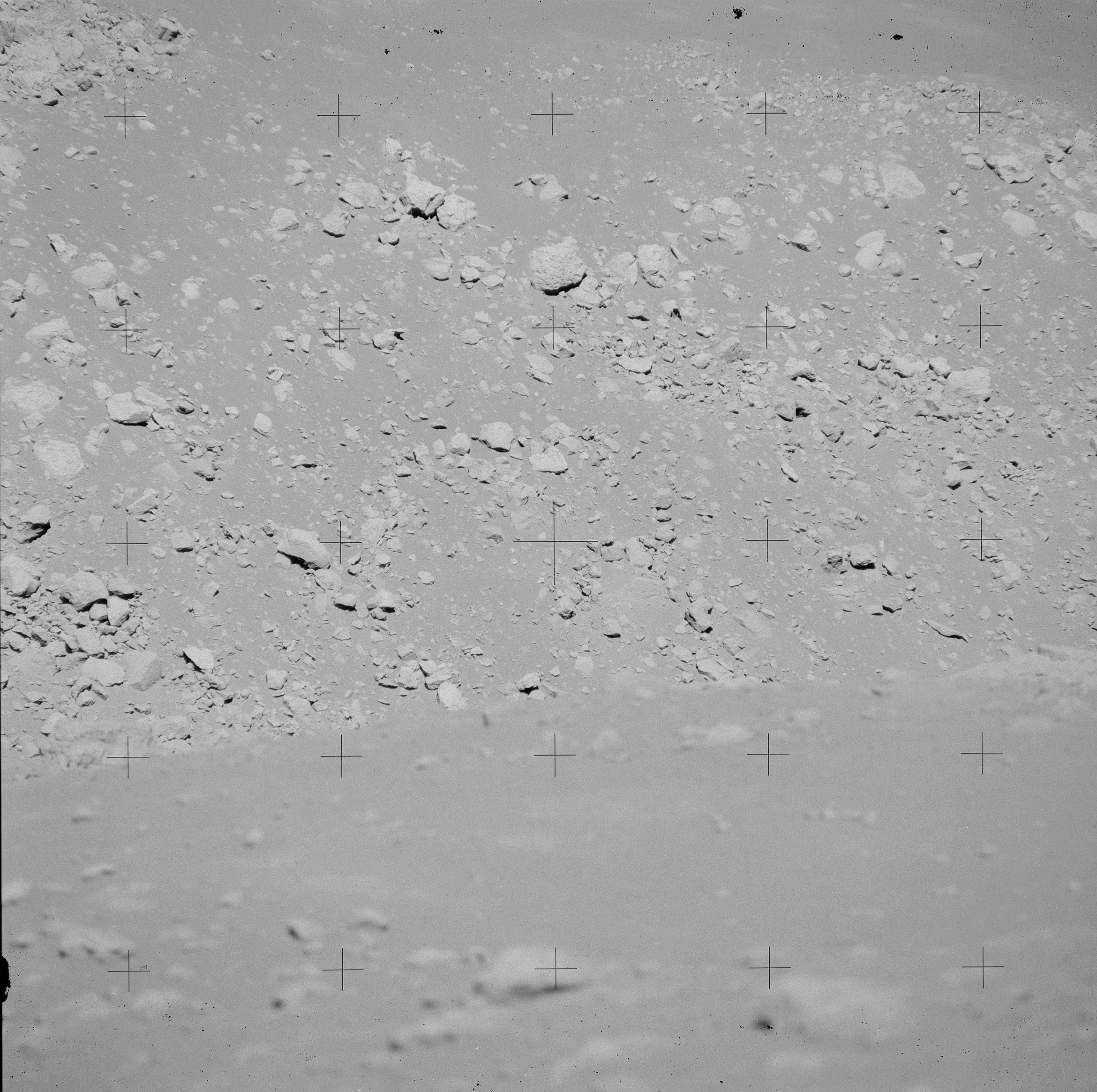 Stephen Tellier scanned a portion of Pan Camera frame 9798, which was taken during CSM Rev 38 at about 151:37. At that time, Dave and Jim were in the LM after the completion of EVA-2. A prominent feature of this image is the darkening of the soil around the LM and along a corridor extending from the LM toward 11 o'clock. See a comparison with frame 9377 by Markus Mehring, who has processed the images to account for differing orientations, different scales due to differing CSM-LM ranges, and different foreshortening due to differing CSM elevation angles. As Jack Schmitt discusses in the Apollo 17 commentary, the surface around the LM became brighter after being swept by the descent engine exhaust. As can be seen in photos taken on the surface, areas subsequently disturbed by the astronauts became relatively dark again. At locations relatively far from the LM, disturbed soil had the same brightness as undisturbed soil, another indication of brightening due to the engine exhaust.Rev. 50 Pan Camera 9809, North Detail ( 332k )
