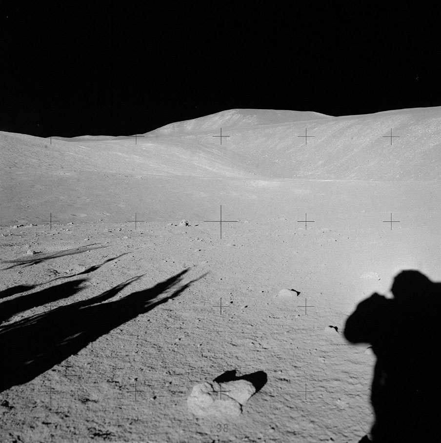 Patrick Vantuyne has combined M119829425L and M119822622L. The separation exaggerates crater depths. In a black-and-white detail from Dave's color SEVA pan, Index Crater in the foreground to the right of up-Sun. The pan was taken starting at about 106:58:27, which was about 0033 UTC on 31 July 1971. At that time, the solar elevation and azimuth were 13.1 and 96.6. The eastern rim of the crater did not cast a shadow at that time, indicating that the inner eastern wall is shallower than 13.1 degrees. Another LROC image, M131623862L, was taken 2156 UTC on 19 June 2010 when the solar elevation was 8.4 degrees. At that time, the eastern half of the crater was nearly filled with shadow, indicating that the inner slope is close to 8.4 degrees. Note that the western rims of some of the small, sharp-rimmed craters within the eastern half of Index are sun lit, another indication that the solar elevation is close to the inner slope.20 July 2011 23:05:01 UTC; image M165842369R; Solar El/Az 19.1/259.1; Full-image center Lat/Long 26.11/3.44; sub-LRO Lat/Long 26.11/0.66; LRO altitude 44 km, resolution 1.66 (width)/0.55(height m/pixel ( 300 Mb TIFF)