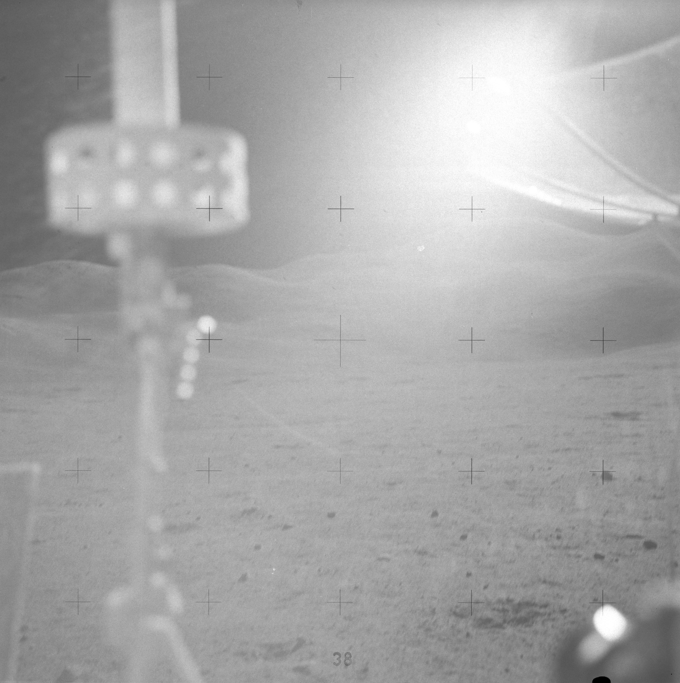 This frame was shot on 1 August 1971 at 21:32 UTC, with the camera looking down vertically. The Sun was 33 degrees above the eastern horizon. Higher resolution versions of M-1676 available from the ASU Apollo Image Archive. Frames 1675 and 1677 also include the landing site. Scan from the original film courtesy NASA/JSC/Arizona State University.Rev. 38 Pan Camera Frame 9798, LM Detail ( 346k )