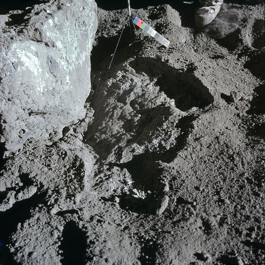 Seventh view of Great Scott. Black and white image. The cube at the lower right is one inch (2.54 cm) on eash side.S71-44778 (5 Mb or 0.4 Mb)