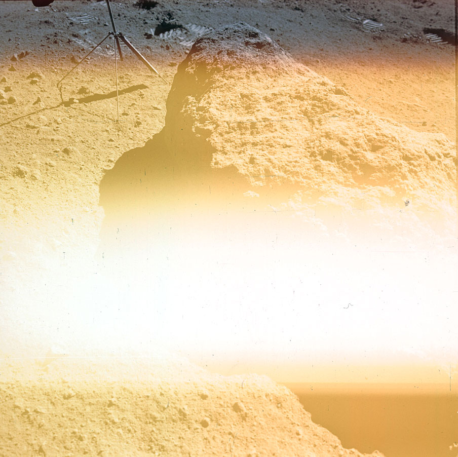 Second view of Great Scott. The cube at the lower right is one inch (2.54 cm) on eash side.S71-43392 (10 Mb or 0.5 Mb)