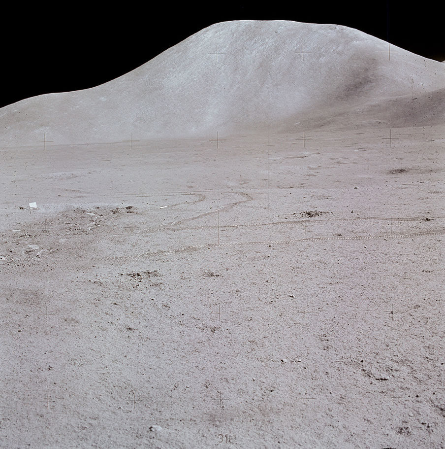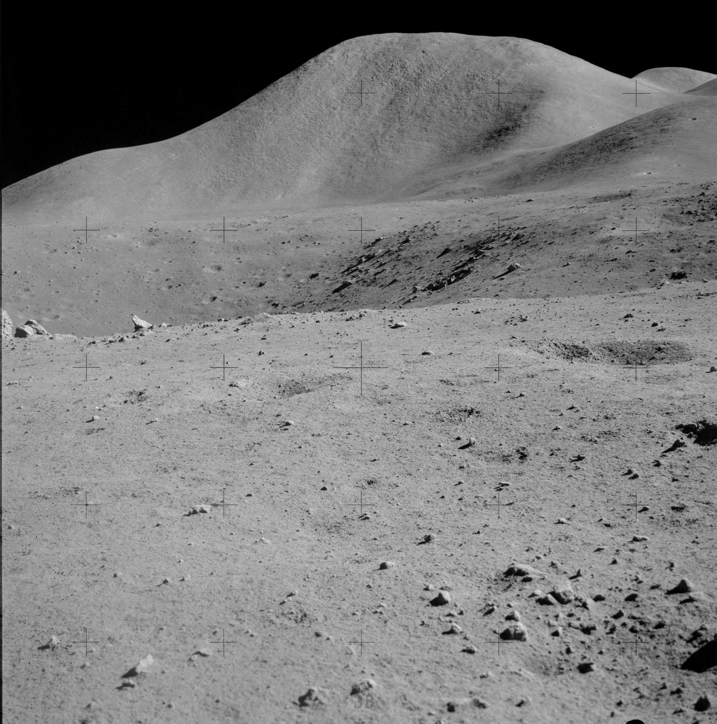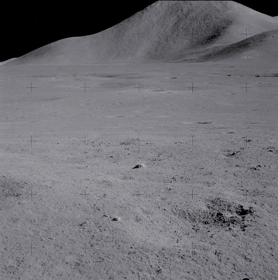 This frame was shot on 31 July 1971 at 15:59 UTC, with a camera tilt of 25 degrees. Higher resolution versions of M-0854 available from the ASU Apollo Image Archive. Frames 0853 and 0855 also include the landing site. Scan from the original film courtesy NASA/JSC/Arizona State University.Rev 27 Mapping (Metric) Camera Frame 0993 ( 13 Mb )