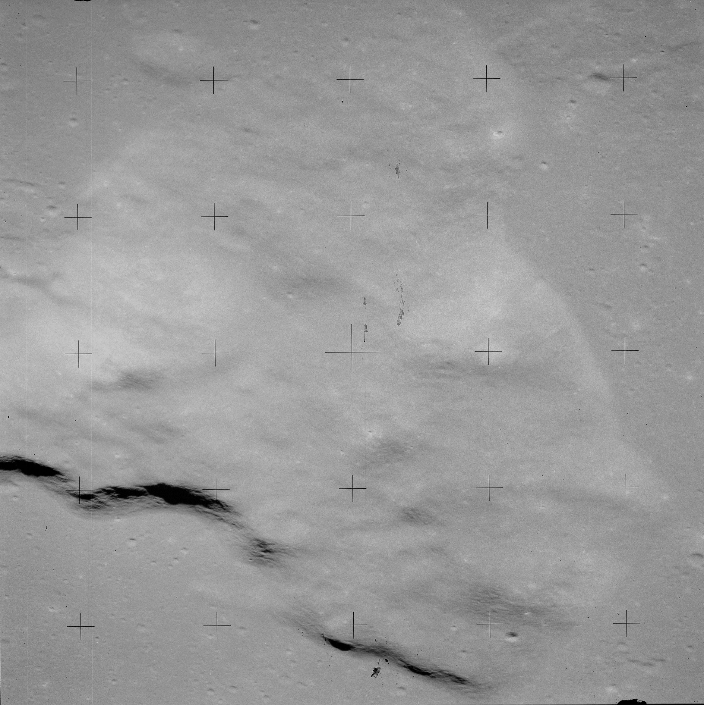 This frame was shot on 1 August 1971 at 13:40 UTC, with the camera titled 25 degrees from vertical. The Sun was 29 degrees above the eastern horizon. Higher resolution versions of M-1422 available from the ASU Apollo Image Archive. Frames 1423 and 1424 also include the landing site. Scan from the original film courtesy NASA/JSC/Arizona State University.Rev. 35 Apollo 15 Mapping (Metric) Camera Frame 1537 ( 3.4 Mb or 269k )