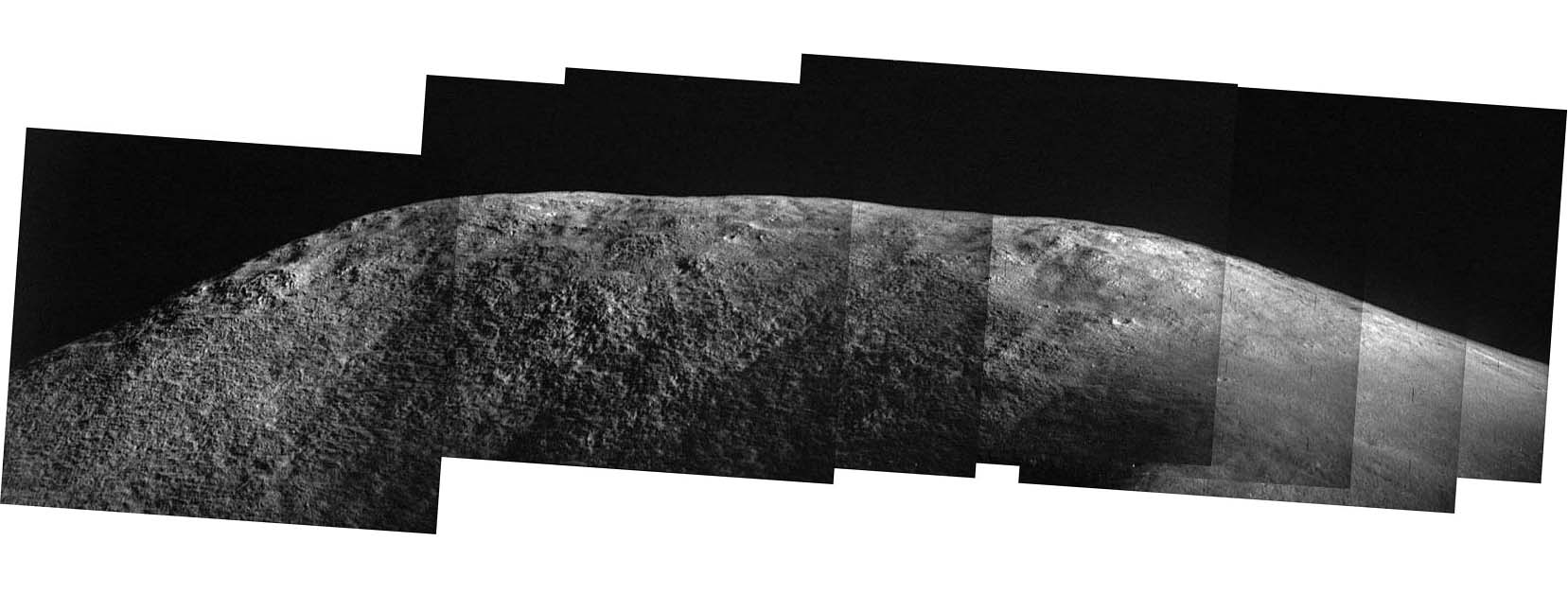 View towards lunar south pole. Mare Australe. Crater Lyot. Rima Schrödinger. Research by David Woods.AS15-96-13100