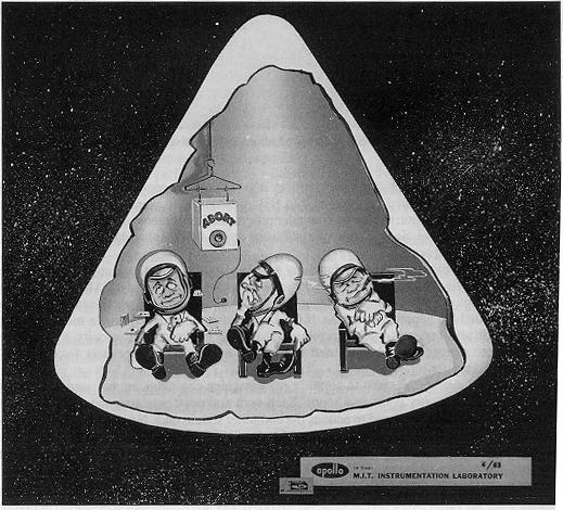 Command Module below decks in the U.S.S. Okinawa. Scan by J.L. Pickering.S71-42195 ( 175k )