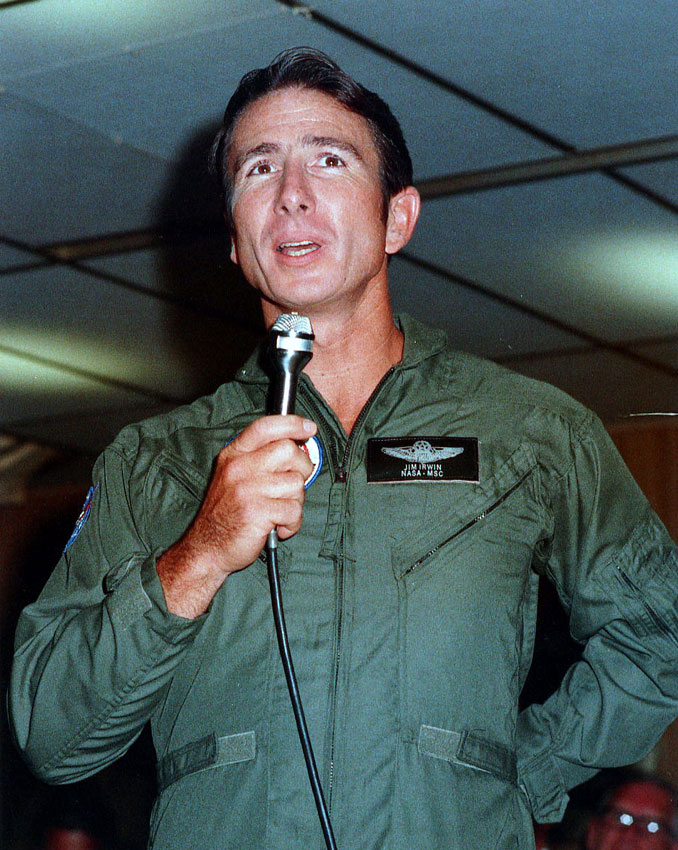 Jim Irwin, flanked by Scott (left) and Worden (right), makes a few remarks after welcoming ceremony at Ellington Air Force Base. 12 August 1971. Scan by J.L. Pickering.71-HC-1046 ( 112k )