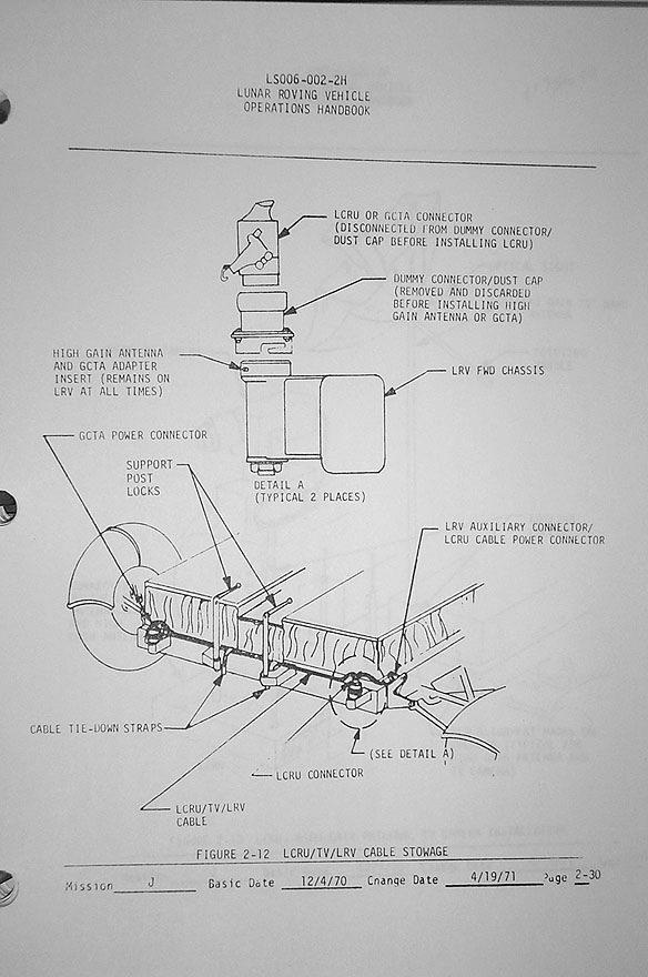 [Duke, from the 1972 Technical Debrief - "Everything went well on the LRV load-up until I tried to get the power connector on from the LRV to the LCRU. The flight gear is really stiff and the cable had a set in it and it was just tough for me to get that Astromate connector on. It took a lot longer than in training, but it finally locked in and that was really the only problem I had on the front end of the load-up."]