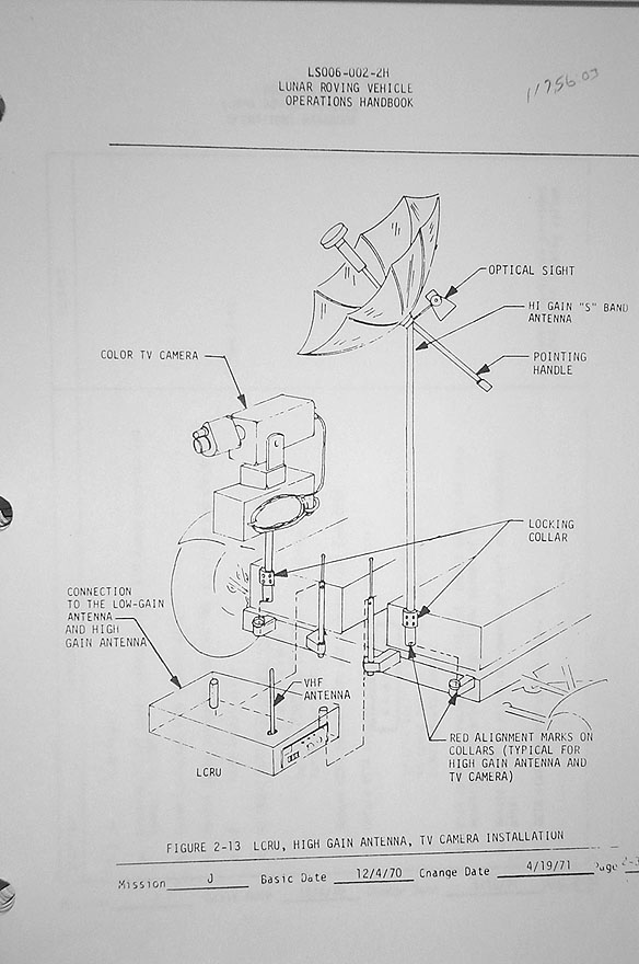 [We have good video of Dave Scott installing the high-gain antenna during Apollo 15. The locking collar at the base of the antenna staff is shown in Detail A in Figure 2-12 in the LRV Operations Handbook.]MP3 Audio Clip ( 13 min 12 sec )