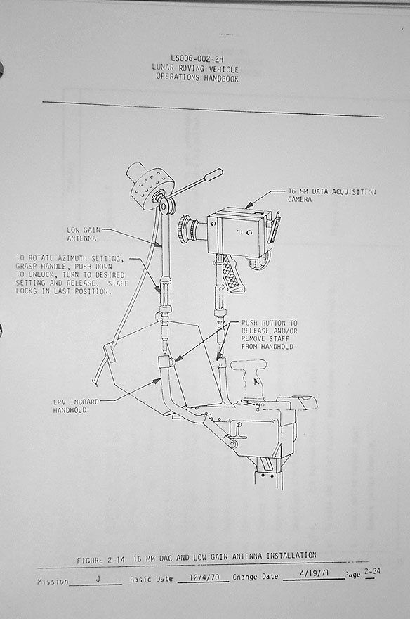 [Charlie has installed the LCRU and the TCU (Television Control Unit) on the front of the Rover and, next, will install the low-gain antenna on the top of John's inboard handhold. The low-gain only has to be pointed to within about 30 degrees of Earth and, because the Earth is nearly overhead, John will not have to change the aiming as he drives. Figure 2-13 in the LRV Operations Handbook shows the installation of the TCU and Figure 2-14 shows the low-gain antenna. Retired RCA technical illustrator James Burns has provided a drawing of the antenna storage canister he did prior to Apollo 15. Figure 3.1-4 from the Apollo 15 Final Lunar Surface Procedures volume (9 Mb) shows the canister stowed on the lefthand side of the MESA. The canister contains both the low-gain and high-gain.]119:50:36 Duke: I really can't believe you got that UV (camera) up so easy. (Garbled)