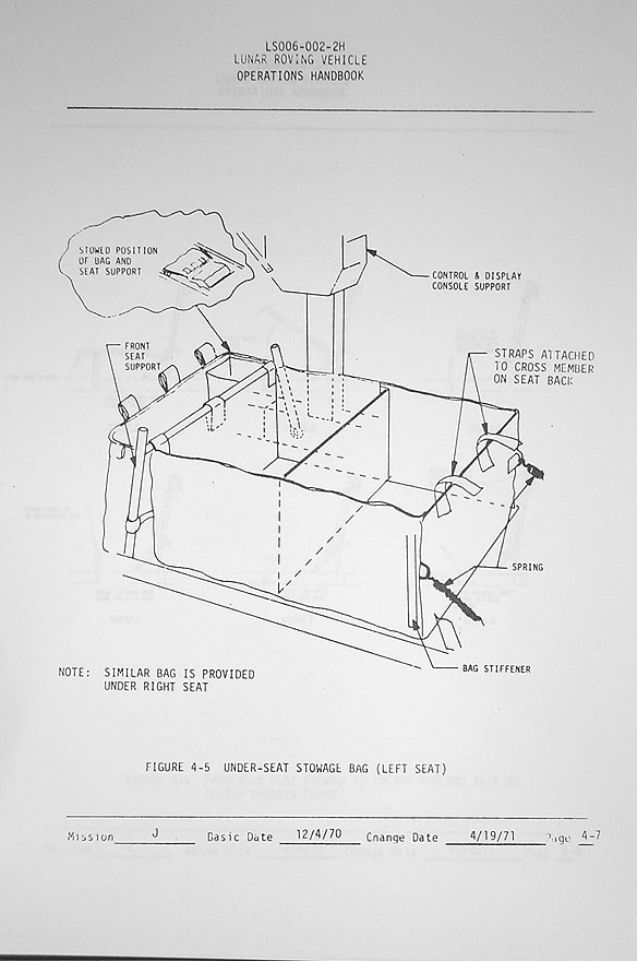 [As per LMP-7, Charlie has probably carried the LCRU over to the Rover and is trying to get low enough to mount it on the front of the Rover. See Figure 2-13 from the LRV Operations Handbook.]119:43:15 Young: Hah! Look at that (protective) bag tear away. Outstanding! Thought I wouldn't be able to do that one. Okay, the UV camera is sitting (properly) in the Quad III pallet, and it looks normal in every respect to me. Let's see if we can get it out of there. (Long Pause)[Jones - "After you get the LCRU out of the MESA, you install it on the front of the LRV. And that must have been fairly low. Would that have been a problem getting down to get it into position?"]