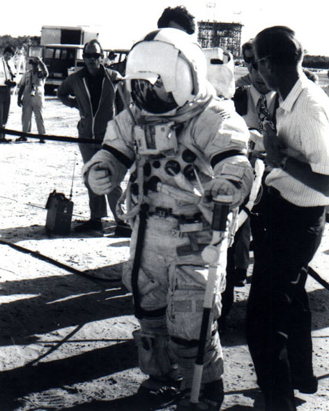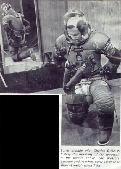 [In terrestrial gravity, kneeling was relatively easy because the astronaut's body weight was high enough to overcome the pressurized suit's resistance to bending, as evidenced by a pre-flight photo showing Charlie kneeling during a suit fitting session. On the Moon, his total weight - including his backpack - wasn't enough to overcome the suit's resistance to kneeling. For some reason, John and Gene Cernan were better able to bend their knees and stay down in a kneeling position.]