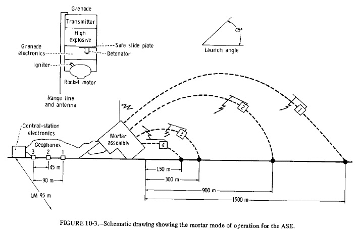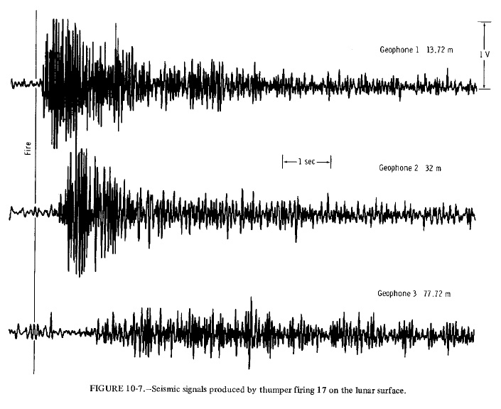 [Three of the four mortars were successfully fired on May 23, 1972, about a month after John and Charlie left the Moon. The mortar that was to have been fired to a range of 1500 meters was not launched due to the fact that the experimenters were no longer sure that the mortar package was level. After the third mortar was launched, either the pitch sensor failed or the mortar package tipped at an unacceptable angle. Excellent data were obtained from the three successful launches and these data, when combined with the thumper data and data recorded during the LM launch, were used to determine the subsurface structure shown in Figure 10-1 from the Preliminary Science Report.]Video Clip ( 3 min 59 sec 1.0 Mb RealVideo or 35 Mb MPEG )[Fendell stops his pan just as the magnetometer is about to go out of view and reverses direction. On comm, we can hear Charlie's breathing.]