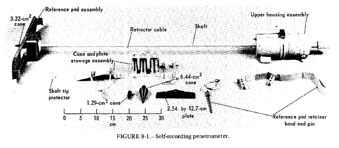 [Charlie is referring to the penetrometer experiment, a long rod with interchangeable conical tips. When using the penetrometer, he pushes the instrument into the soil and a built-in sensor measures the penetration depth and the force used. Figure 8-1 from the Apollo 16 Preliminary Science Report shows the penetrometer and attachments. The three cones in the figure have base areas - perpendicular to the penetration axis - of 1.29, 3.22 and 6.44 square centimeters. According to the Preliminary Science Report, only the two smaller cones were flown and Charlie's 'two-tenths' refers to the 1.29-square-centimeter cone and 'five tenths' refers to the 3.22. Journal Contributor Keith Hearn notes that 1.29 cm2 = 0.2 in2 and 3.22 cm2 = 0.5 in2. Station 10 is a stop planned at the end of EVA-2 when John and Charlie are almost back to the LM. EVA-2 cuff checklist pages LMP-18 and LMP-19 show the penetrometer activities planned for Station 10.]121:56:15 Young: Watch out, Charlie.[Duke - "They had three or four sizes of cones for the head of the thing. The smallest was that 'two' and my fear was that, if I put that on, it was going to go into the ground all the way - (maximum penetration possible is 76 cm) - and not give us a good reading. In fact, later on here (during EVA-2), you'll see one time I did push on one and it did go all the way in and I fell down."]