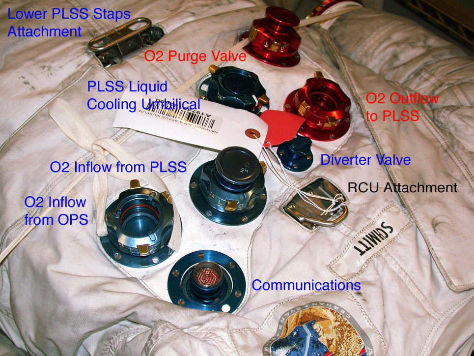 Close-up of the chest from over the left shoulder. The connectors are identified in a labeled version ( 314k ). Blue connectors are for flow into the suit and blue connectors for outflow. The diverter valve, which is between the RCU attachment and the red tag, " directs the inlet gas flow to the helmet duct (valve in the Close position) or diverts a portion of that flow to the torso duct (Open position) as preferred by the crewman. The ventilating gas flows from the helmet down and over the body to the arm and leg extremities to removebody gas perspiration and heat. Outlet gas flows from the extremities through ducts to the exhaust connector. " See Figure 2-4 and related material from the EMU Handbook.
