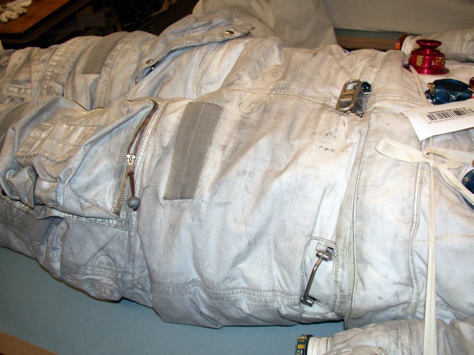 Showing the area beneath the utility pocket. Dean Eppler notes that, in training photo KSC72PC-440 taken in July 1972, shows no Velcro strips below the utility pocket and two short, vertical strips on the right knee.