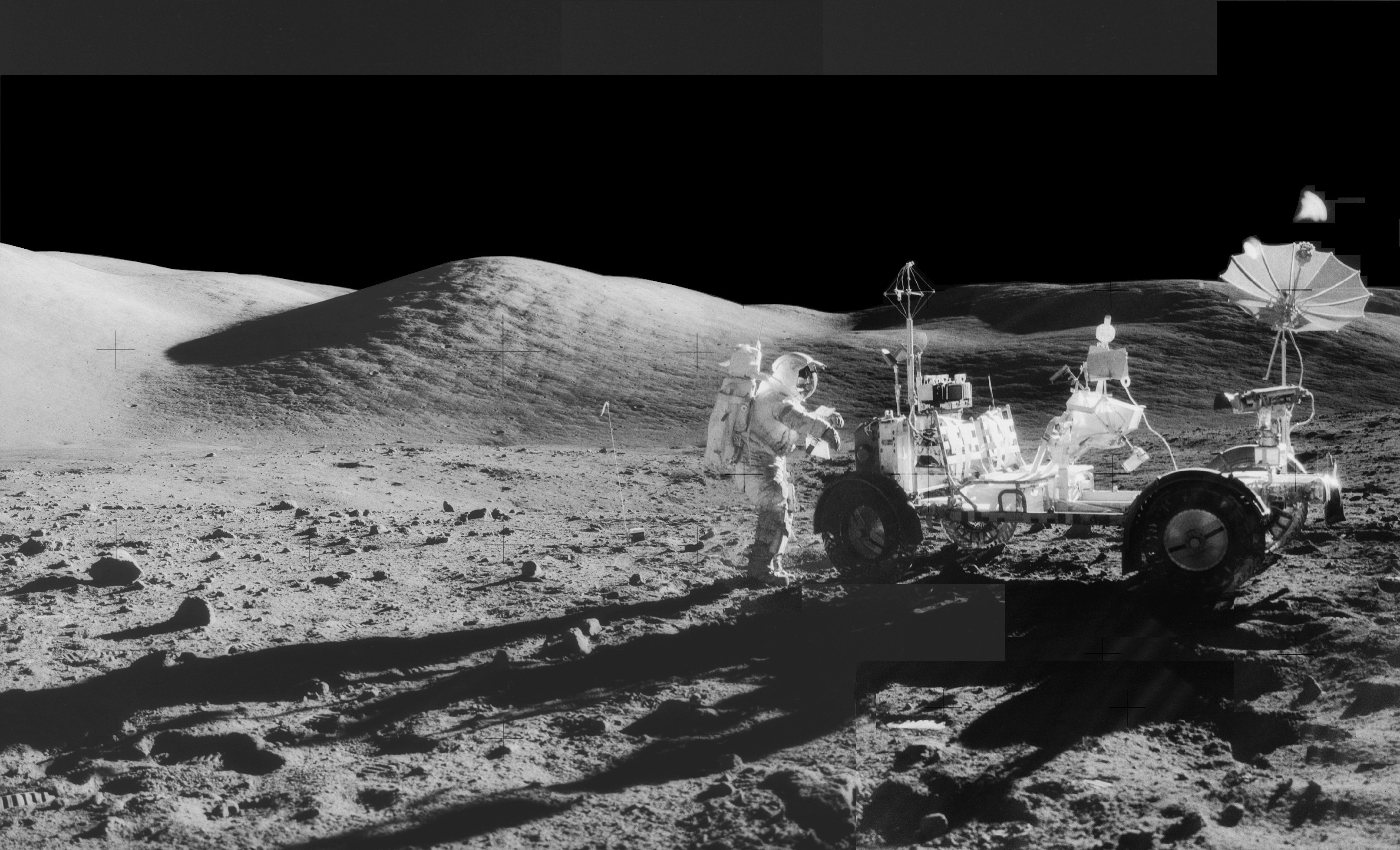 [Harland calls attention to the difference in shadow lengths in this view compared with the lengths of the astronaut shadows in Gene's early pan. The dominant factor that produces the different shadow lengths is the different ground slopes on which the shadows are falling at this low Sun angle. A comparison of the pans suggest that Gene parked on a slight rise. Note, for example, that the Rover shadow can not be seen in Gene's pan, which was taken from east of the Rover. Clearly, the Rover shadow visible in Jack's pan falls on a downslope - relative to the Sun - while the astronaut shadows in Gene's pan may fall on an upslope. The Sun is about 18 degrees and, on a level surface, a 2-meter-high suited astronaut would cast a 6.15 meter shadow. A modest two degree upslope would reduce the shadow length to 5.49 meters while a two degree downslope would increase it to 6.97 meters. A second factor which influences perceptions of shadow length is orientation of the shadow relative to the observer. In Gene's pan the astronaut shadows fall more or less along the line of sight, which can make them look shorter than they really are while, in Jack's pan, the shadows run more nearly across the line-of-sight and suffer little foreshortening.]
