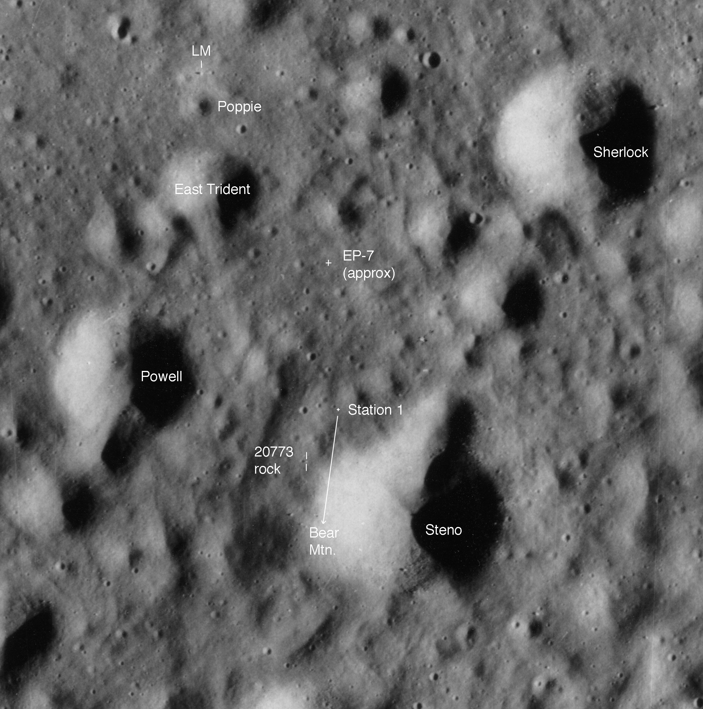 [On CDR-30, Trident is the trio of craters just to the left of the sharp bend in the planned return traverse at 296/0.5.]122:40:12 Schmitt: Look at this thing. That looks like the same kind of rock except it doesn't have any vesicles.