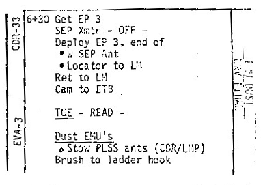 Gene wrote this note on the back of his EVA-3 cuff checklist before the prior rest period. It is a 'tickler' to remind him of what he wanted to say prior to climbing the ladder for the last time. Above the line is the text of the plaque afixed to the ladder and, below the line, the words "Chall(enge) of Apollo. Door Promise." See the transcript and discussion following 170:41:00. Photograph of the flown checklist page taken by Larry McGlynn at the Kansas Cosmosphere in 2000.