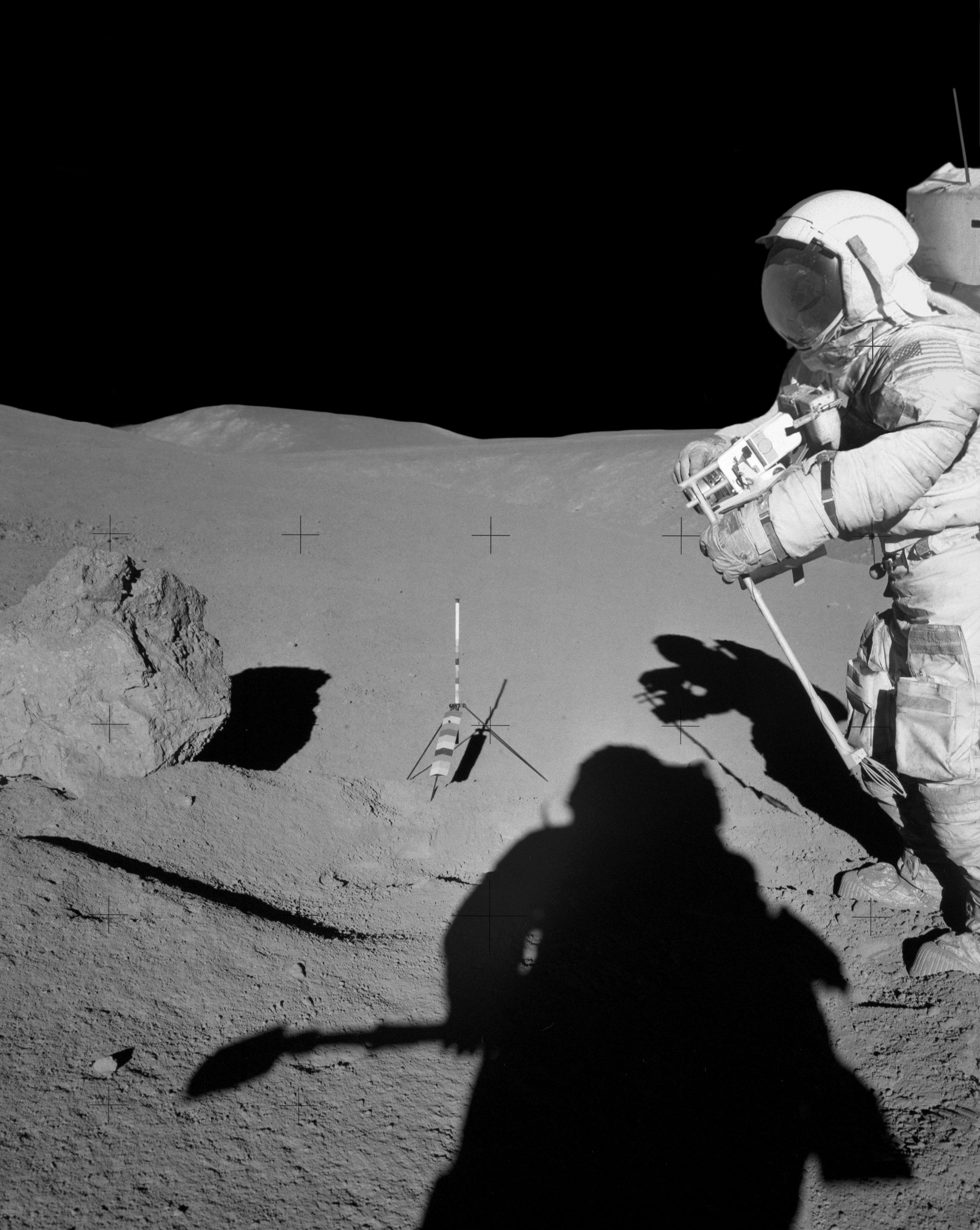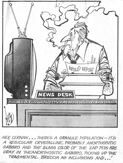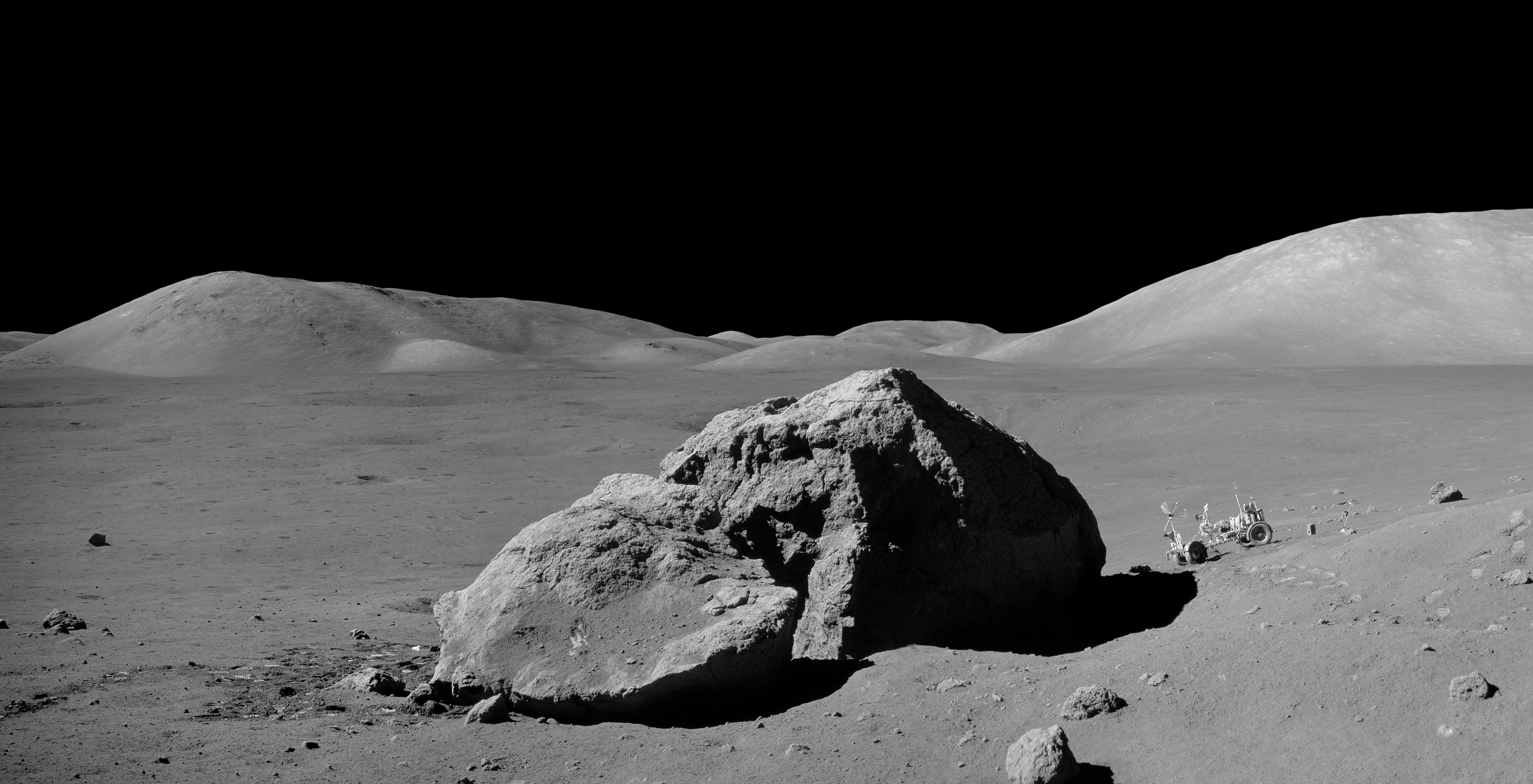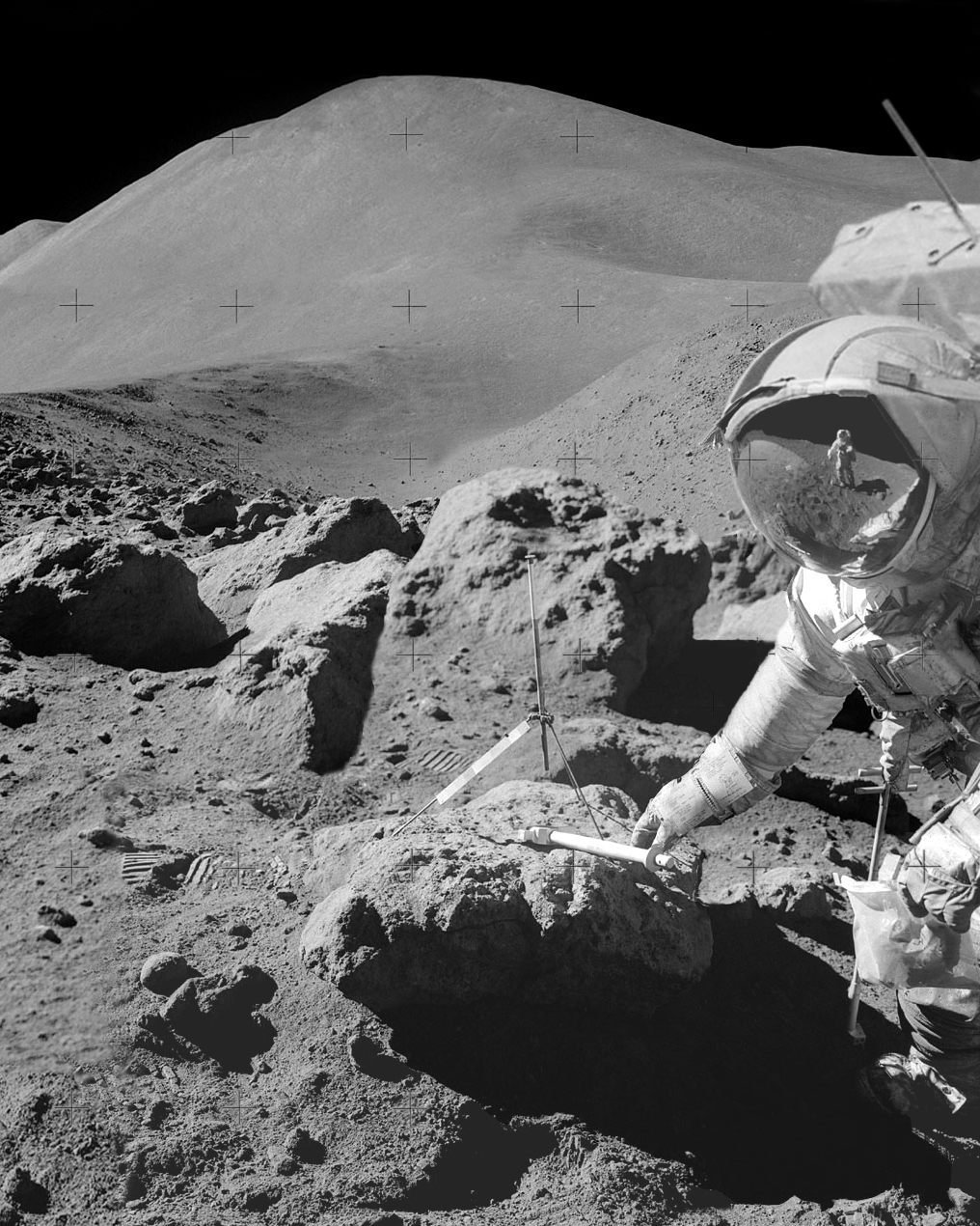 "This image is derived from one that I made as a serious, monochrome rendition of Tracy's Rock (0.5Mb), which is at Apollo 17 Station 6 in the valley of Taurus-Littrow. That image is in the Journal, too. It was based on a set of high-definition frames that were supplied by Mike Gentry at NASA Johnson and were scanned by Ron Wells. I downloaded and mosaicked them. By holding that resolution, I produced an enormous image; but scrolling across it is half the fun!""I saw that Jack Schmitt wasn't in frame, so I went to another frame, which was only 30-cm wide, in which he was present, and borrowed him. But he was the wrong scale, and he didn't blow up all that well; he looked a little fuzzy when I pasted him in, so I deleted him and went to bed in disgust, because without someone in the frame to provide a sense of scale, that block could be any size."