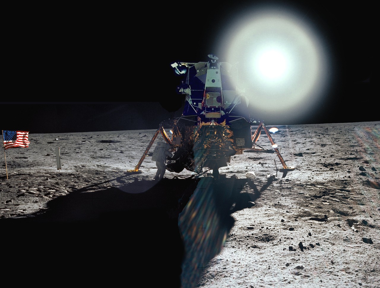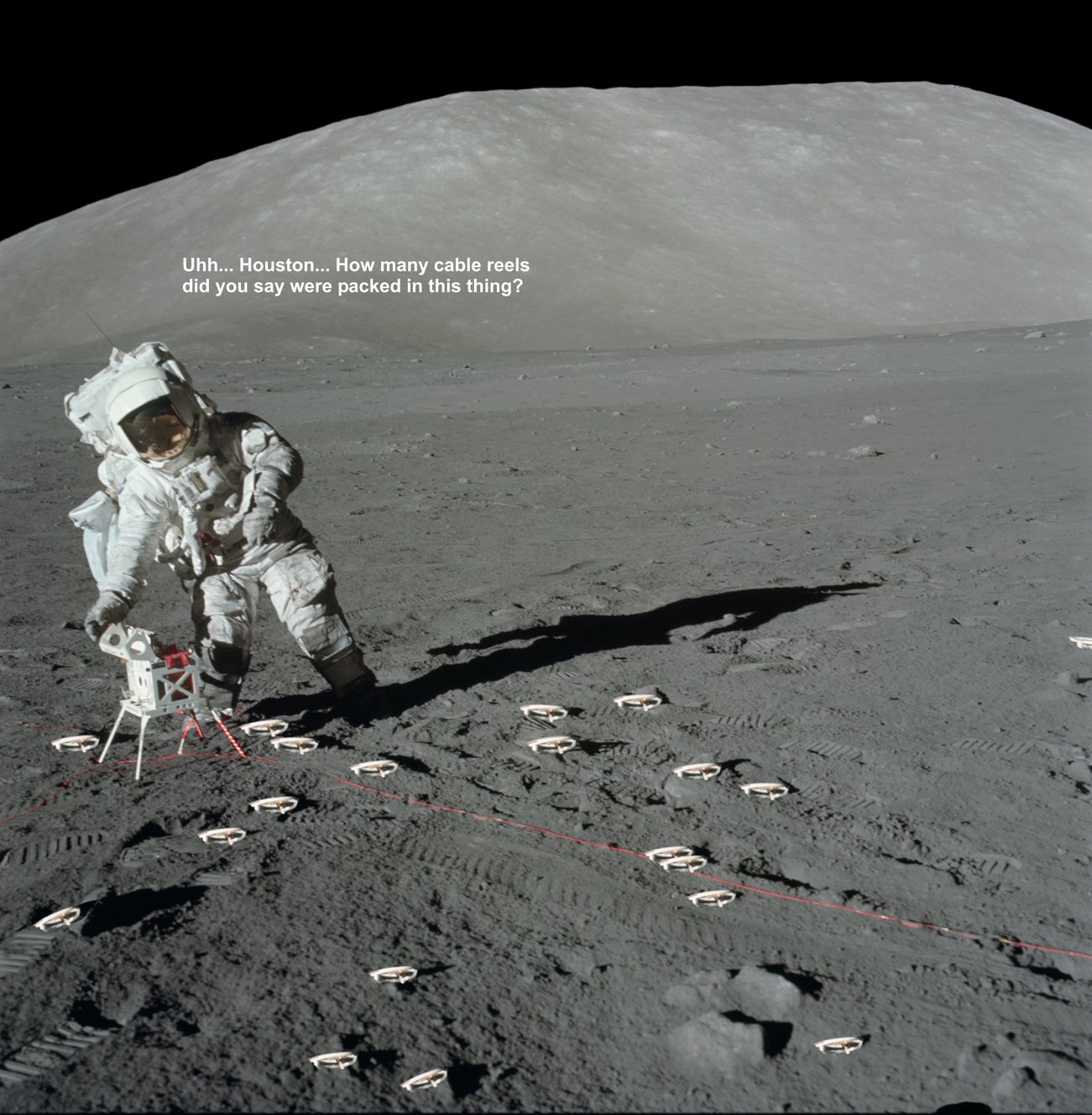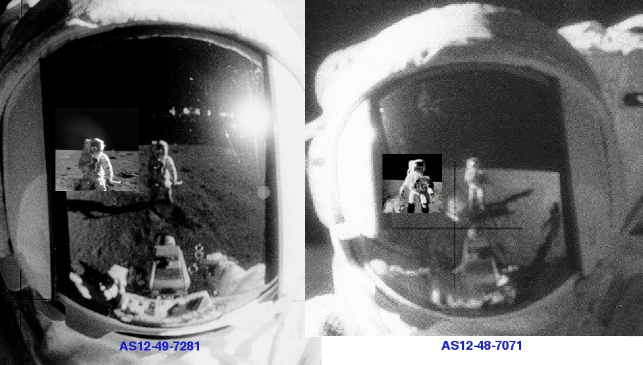 "The next day, I took another look. It was still magnificent. So I borrowed a few more shots of those intrepid moonwalkers Dave, Jim, John and Charlie, and put them in too. It was truly hilarious! Over the last week or so, I've added some of Al (Shepard), Ed and Buzz. I belatedly sought out a few of Gene and Jack and put them in. I'll see about Pete and Al, and might even put in their Surveyor. There wasn't a Neil available, however; so, although he was the first to tread the lunar dust, he isn't represented here, but this is probably for the better because he never did like crowds."