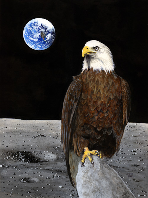 Your friendly ALSJ Editor mentioned to Ron that his LM brought to mind a Sumo wrestler, crouched and ready to charge. "I agree that the overdone large stance of the legs and the 'bent-over' forward face part of the lander give it a Sumo-like appearance - interesting comparison. The artwork is a drawing in the strict sense - colored pencils and china ink, a bit enhanced by CG.