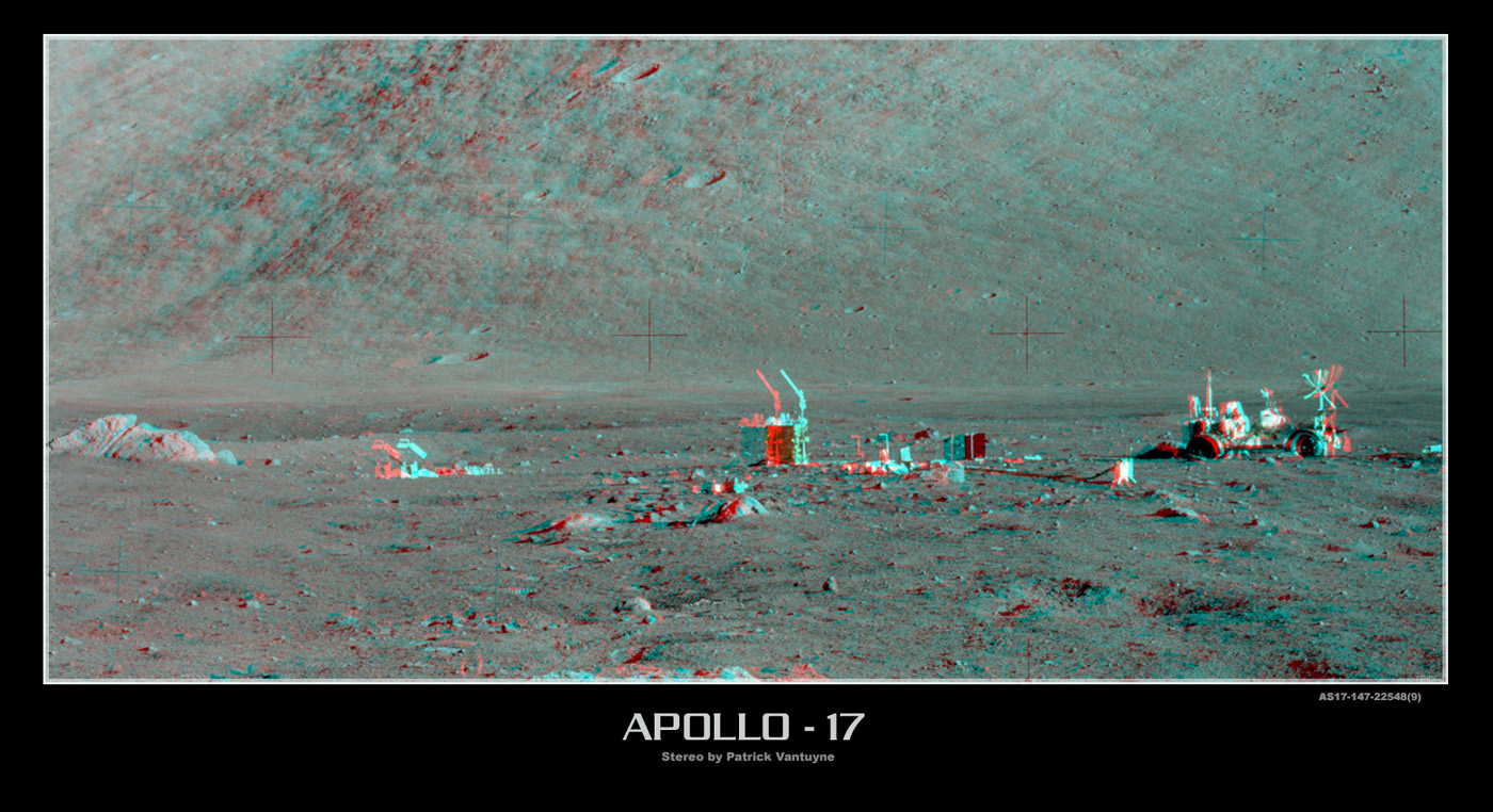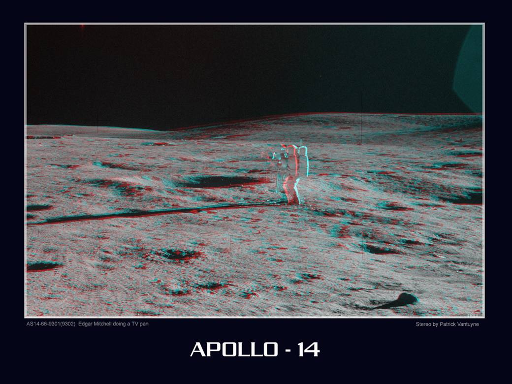 "Inspiration struck, however. Expanding Jack hadn't worked, but shrinking him might, so I leapt out of bed and hunted for another frame of that scene, with him in; but I hadn't downloaded much Apollo 17. I'd been working on Apollo 15 and 16, and was only just starting reading up on 17, so I didn't have that shot on file. As a joke, I stole a picture of Jim Irwin saluting Old Glory on the Plain at Hadley, a high-definition frame which I'd received in the mail a few hours earlier from Kipp Teague, as a swap for sending him the pan of Tracy's Rock, and I shrank him down and stuck him on top of the rock. It was magnificent! So I went back to bed feeling pretty pleased with myself."
