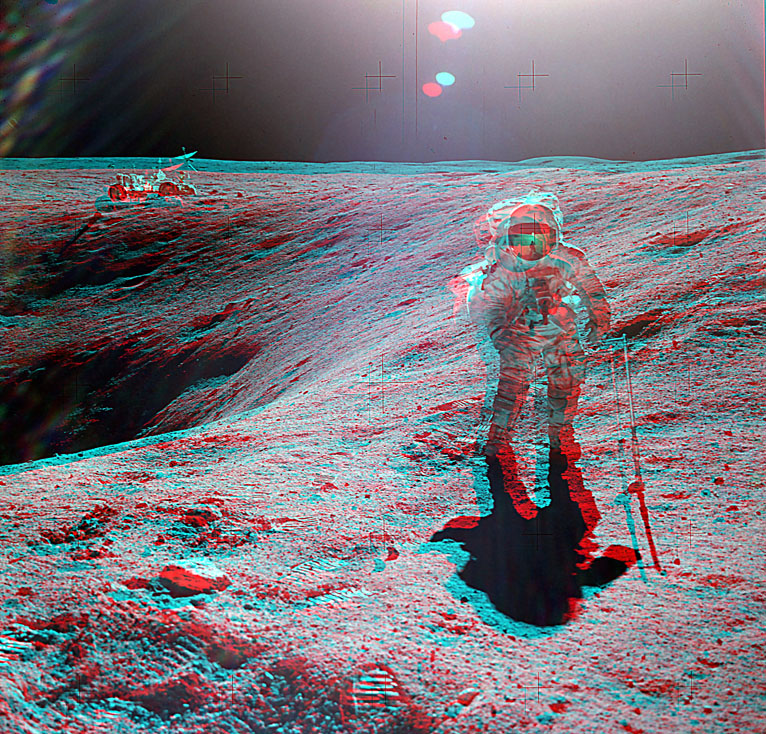 "What started as an exercise in documentation (producing the serious pan), spun-off a nice bit of fun, but there's a serious side to this image, and that's the fact that it is an exceedingly good illustration of the difficulty of judging distance on the lunar surface. In the real pan, I had no difficulty in accepting that the valley is 10 km wide, and that the South Massif is 2,500 meters high. I would never have guessed that from looking at the picture, but I can accept it without it jarring. That's the problem that the guys faced. Only, in their case, there was nobody to tell them how far away things are. Of course, they knew from their maps that the valley was that wide, and that the massif was that high. But how large are those craters out there? And, hence, how far away are they? In fact, the big crater behind the rock is Henry, and it's a kilometer or so off. I know that because I have the map, too. But I couldn't have said without it. By placing a little Jack Schmitt on its rim (borrowed from a pan at Camelot, where he was caught running back to the Rover), that crater suddenly becomes a whole lot closer, and a lot smaller. In the real world, if he'd really been on the rim, he'd have been no more than a pixel high."