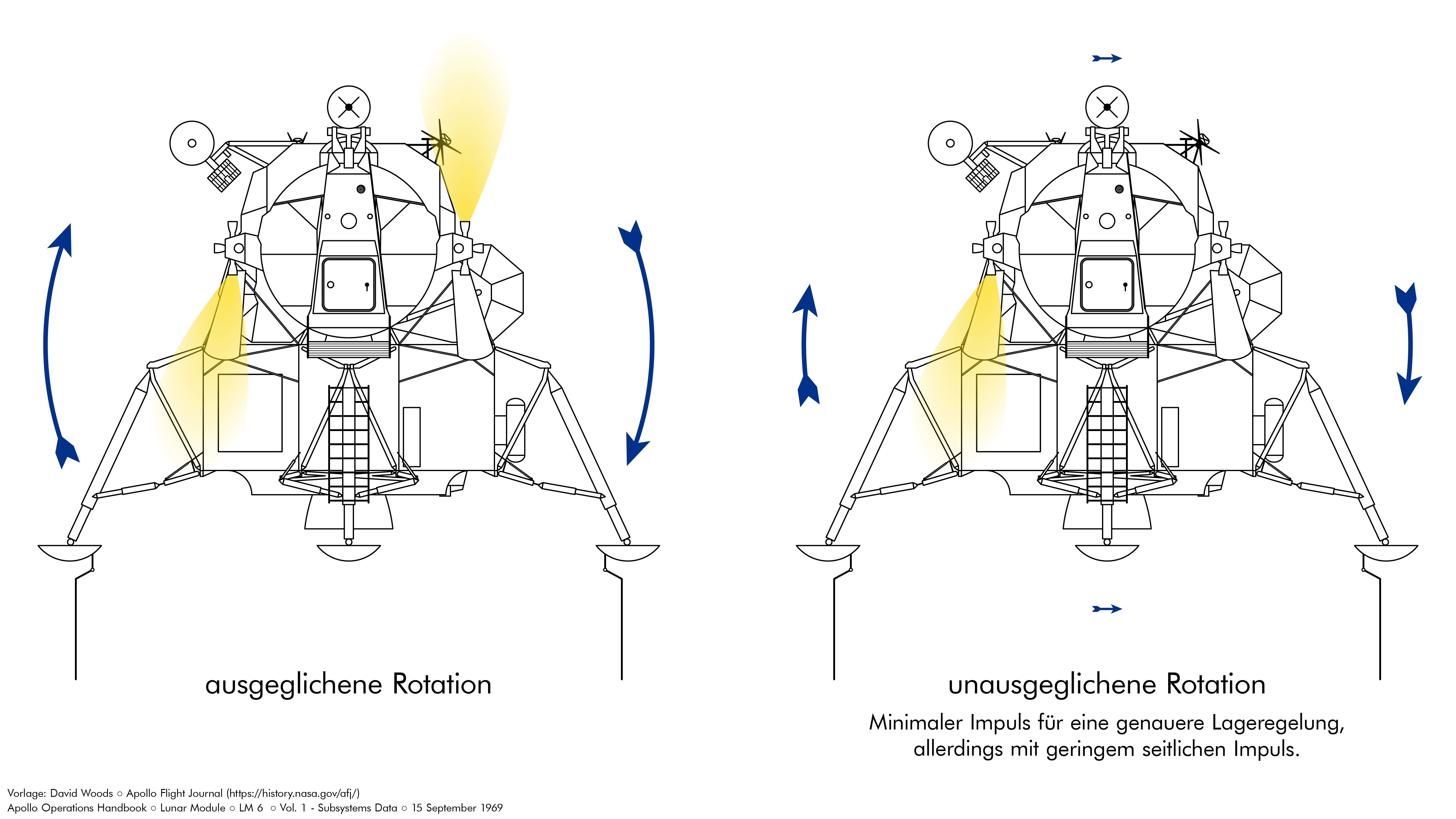 RCSReaction Control System) diese drei Restwerte auf null bringen, das heißt, überschüssige Geschwindigkeit abbauen, oder bei zu geringer Geschwindigkeit etwas beschleunigen. Das wurde als die Restwerte auf null bringen