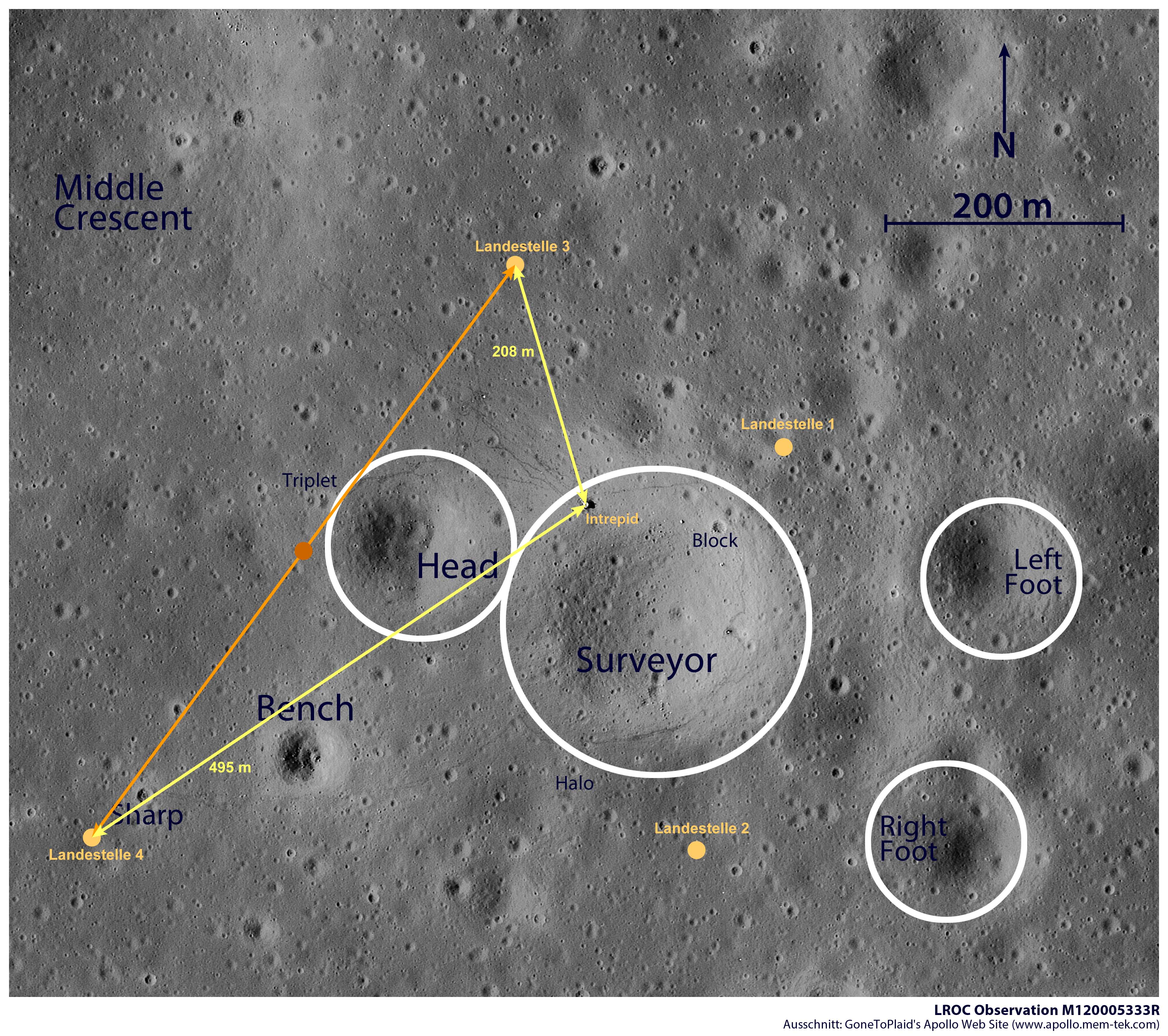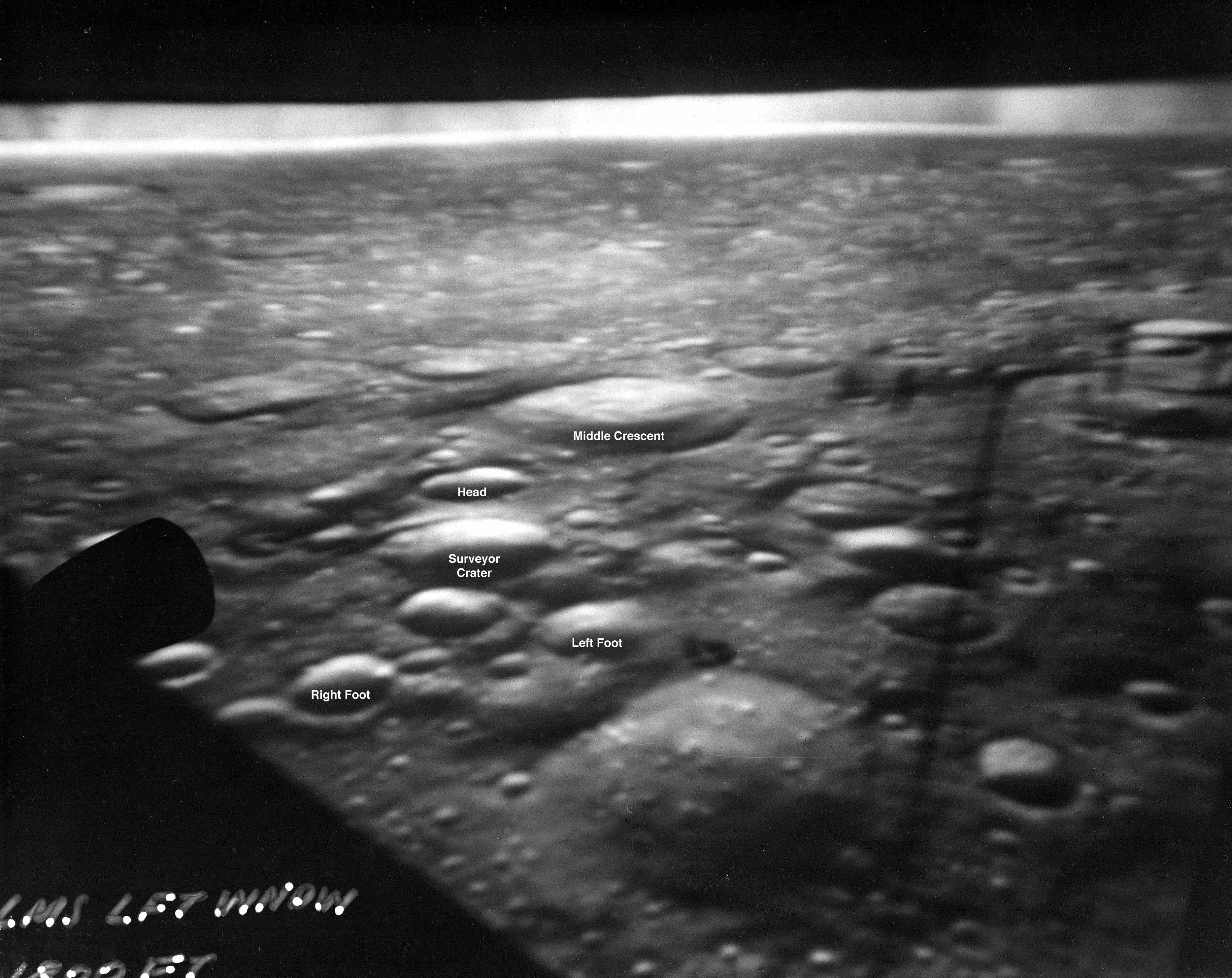 Die zwischen Landung und EVA aus dem Fenster aufgenommenen Bilder AS12-48-7023 bis AS12-48-7033 wurden zu einem Panorama zusammengestellt. Den großen Krater am Horizont sieht man am besten auf AS12-48-7024. Abbildung 10-13 im Vorläufigen wissenschaftlichen Bericht zu Apollo 12 (Apollo 12 Preliminary Science Report) zeigt, wo die Krater Bench, Head und Middle Crescent auf diesen Bildern zu finden sind.