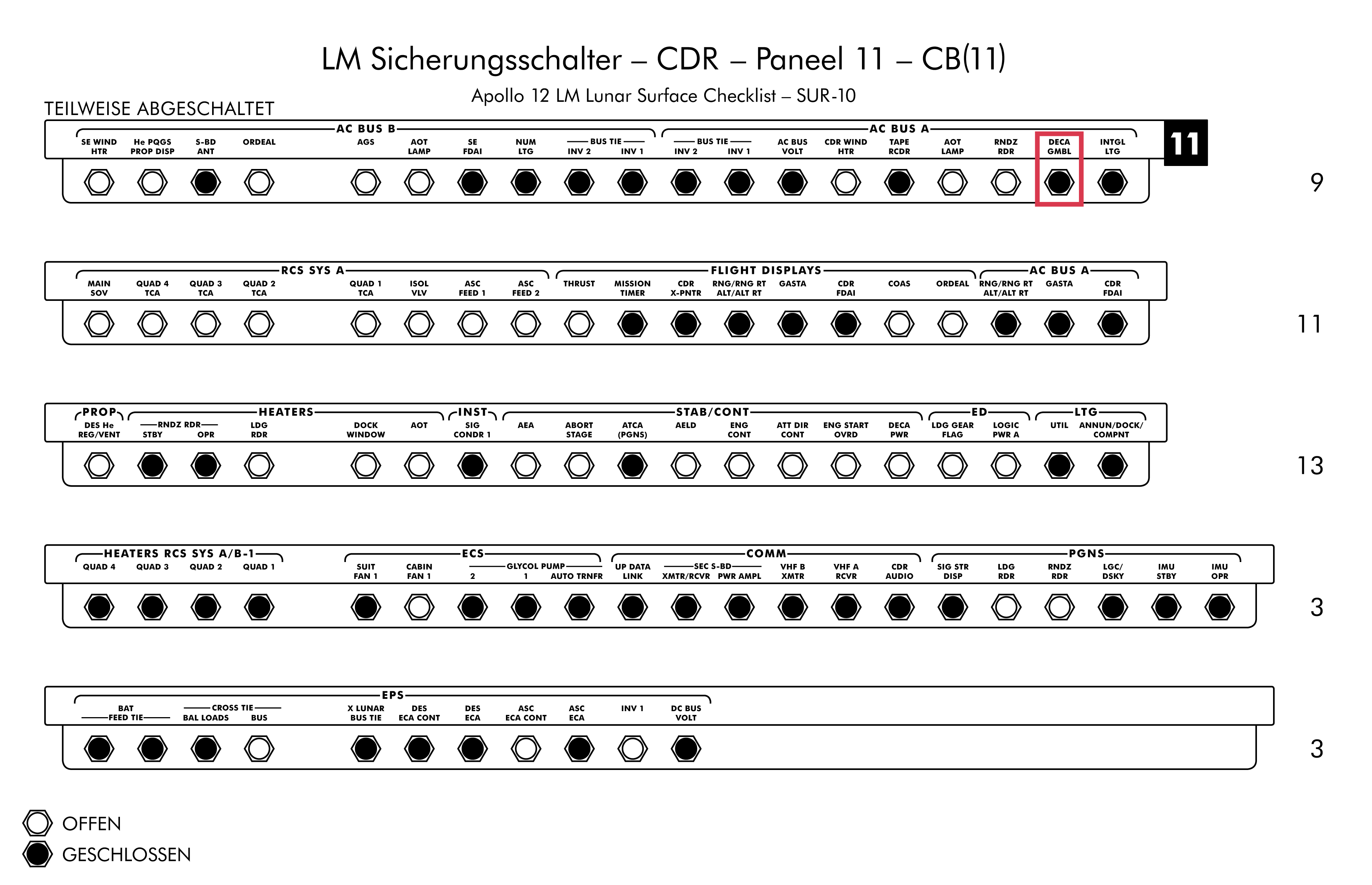 DOIDescent Orbit Insertion bekommen wir noch. Helme und Handschuhe sind angelegt. (Sicherungsschalter für) Kabinendruckherstellung ist Geschlossen. Verteilerventil für Sauerstoffversorgung des Anzugs auf Aussteigen, Aussteigen. Kabinenregulatoren A und B, Aussteigen. Und wir sind bereit für Umschalten auf Datenübertragung. Gleich geht für uns die Ede auf. Bei dir sollte sie jetzt schon aufgehen, Dick.