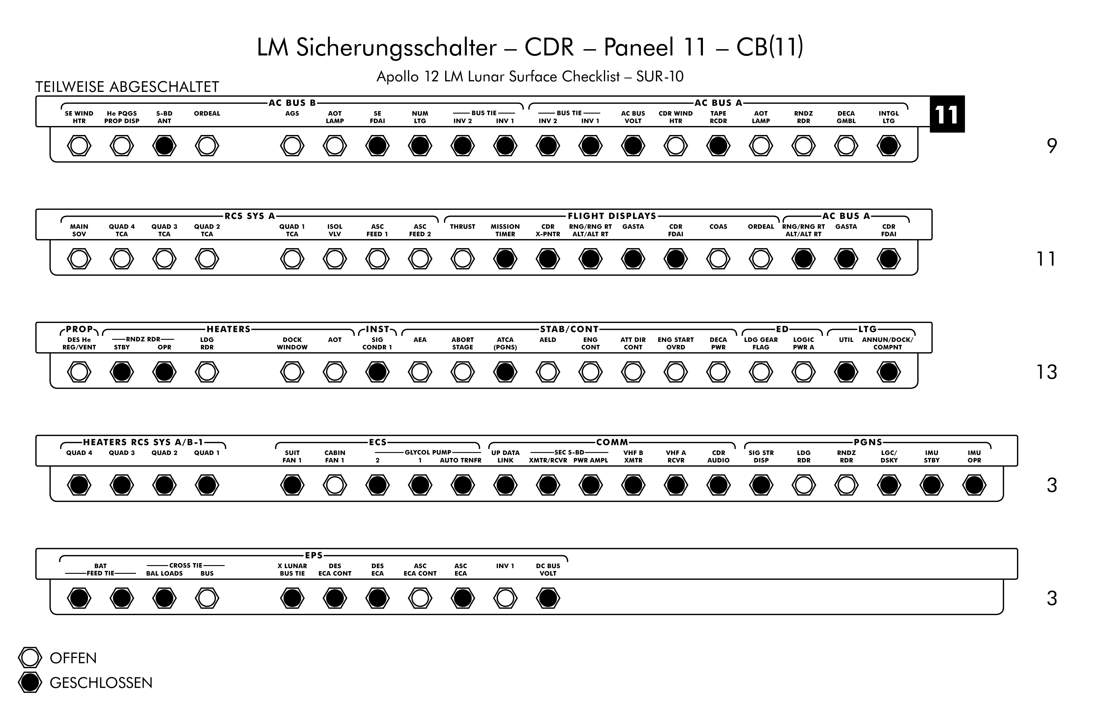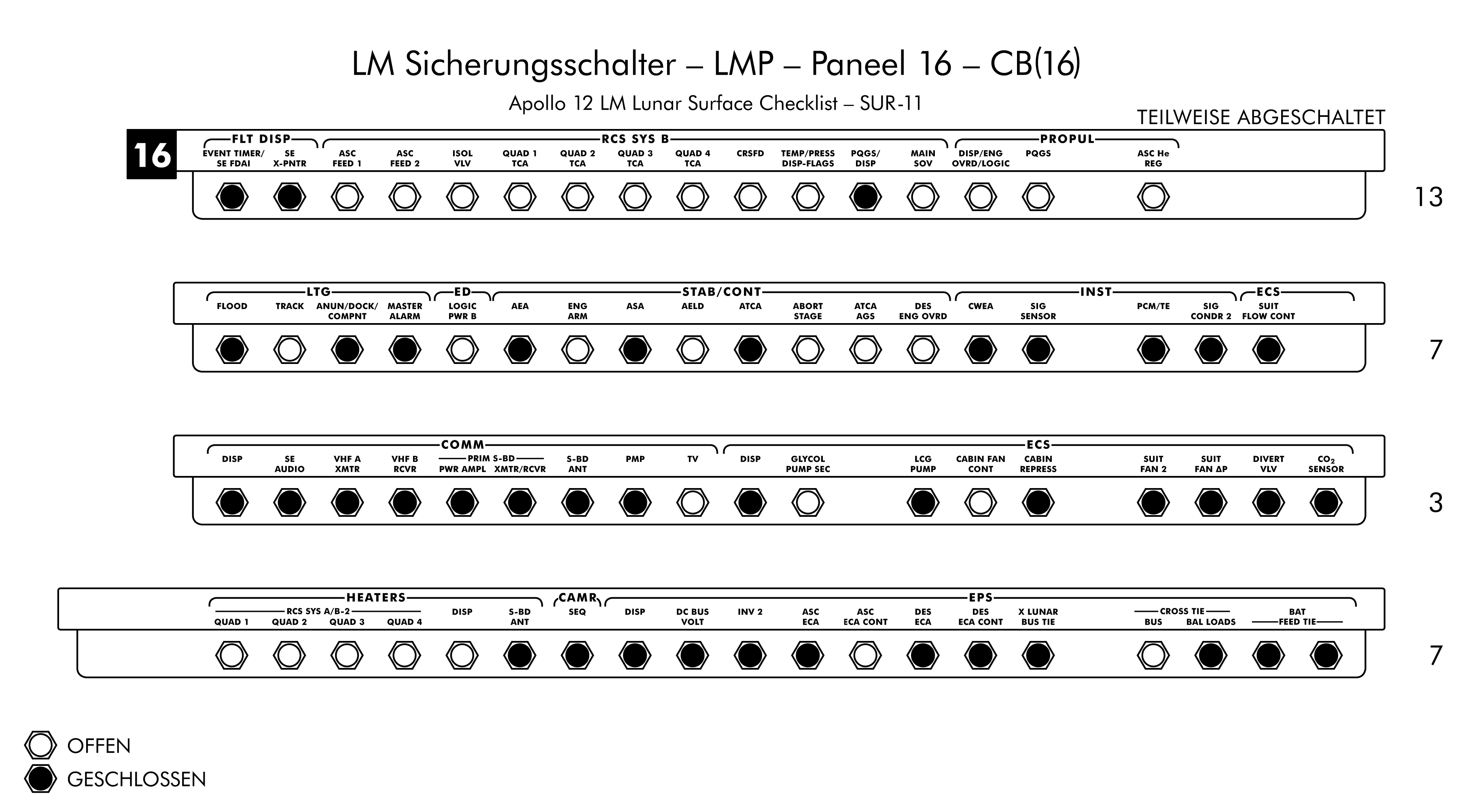 Während dieser Funkpause rekonfigurieren Pete und Al die Sicherungsschalter für die Dauer ihres Aufenthalts. Die Schemen der neuen Einstellungen sind auf SUR-22 und SUR-23 abgebildet. Auf SUR-24 stehen die notwendigen Schritte, falls eins der PLSSs