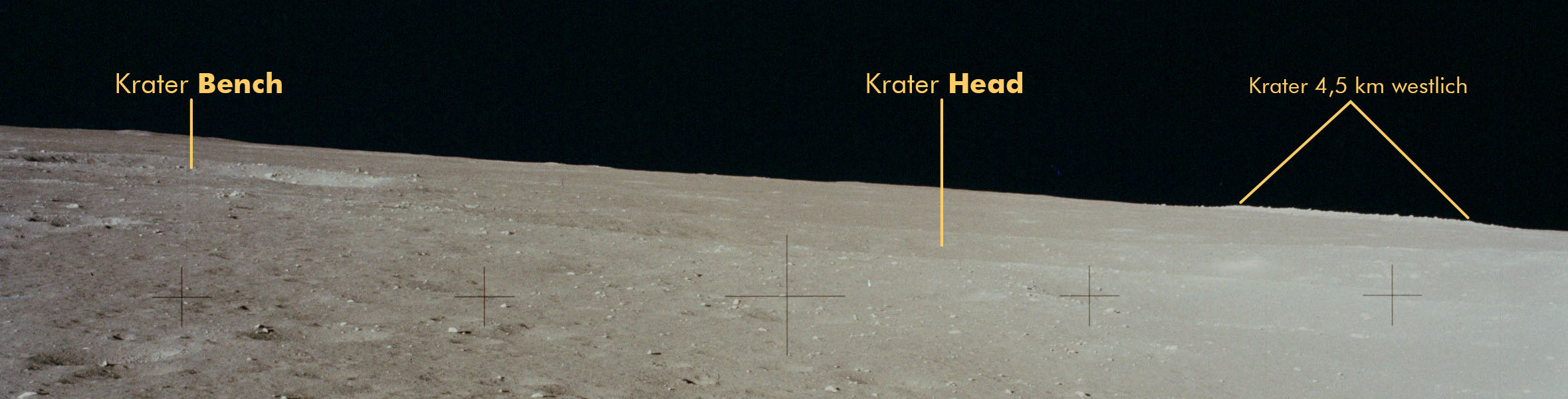 Gerade war von Krater Middle Crescent die Rede. Der Krater hat einen Durchmesser von etwa 450 Metern (1500 Fuß) und sein Rand ist ca. 300 Meter (1000 Fuß) vom Landemodul entfernt. Wie für die Astronauten während des Apollo-Programms normal, hat Al hier ebenfalls Distanzen und Größen unterschätzt.