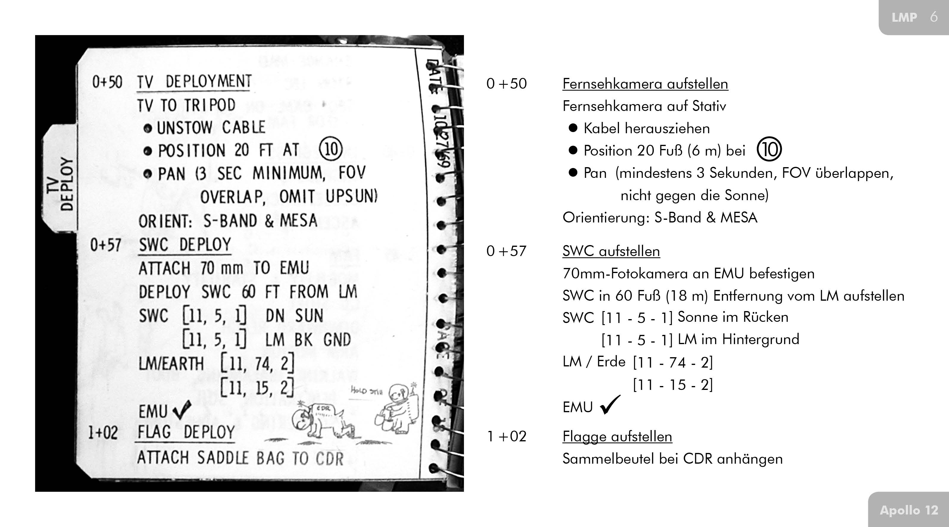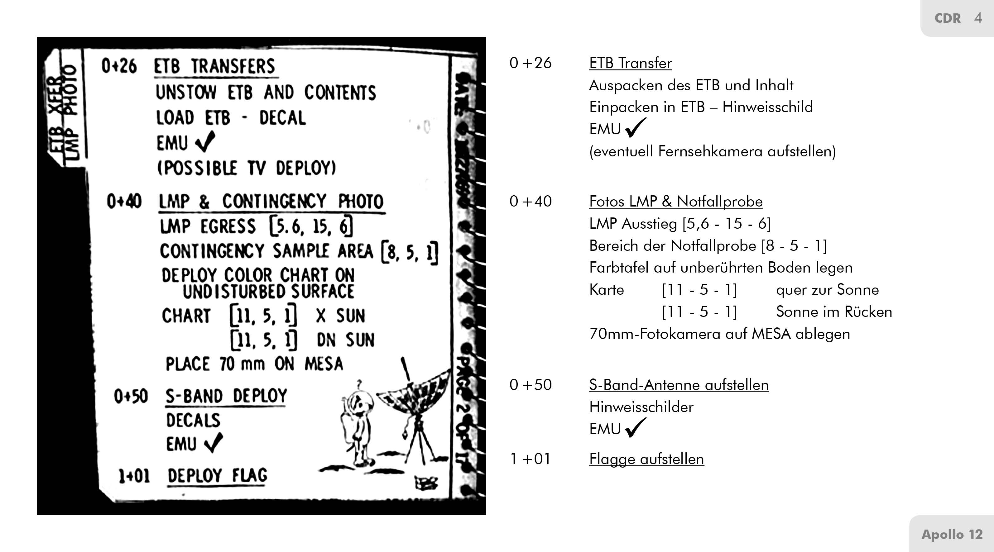 Petes Manschetten-Checkliste enthält auf der vierten Seite im Abschnitt S-Band-Antenne aufstellen lediglich den Eintrag Hinweisschilder. Auf den Seiten SUR-135 und SUR-136 der Checkliste für den Aufenthalt auf der Mondoberfläche (Apollo 12 LM Lunar Surface Checklist) sind diese Schilder abgedruckt.