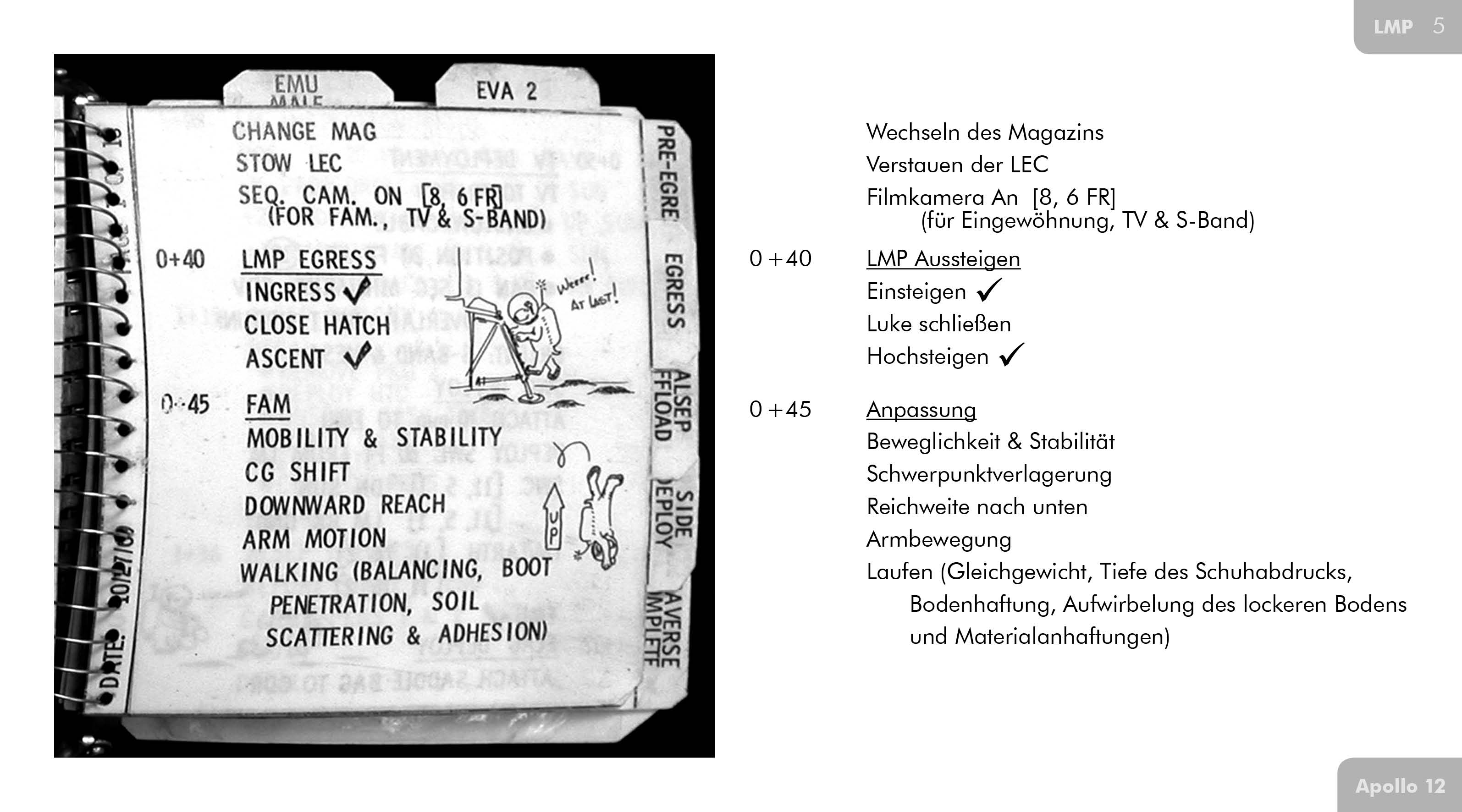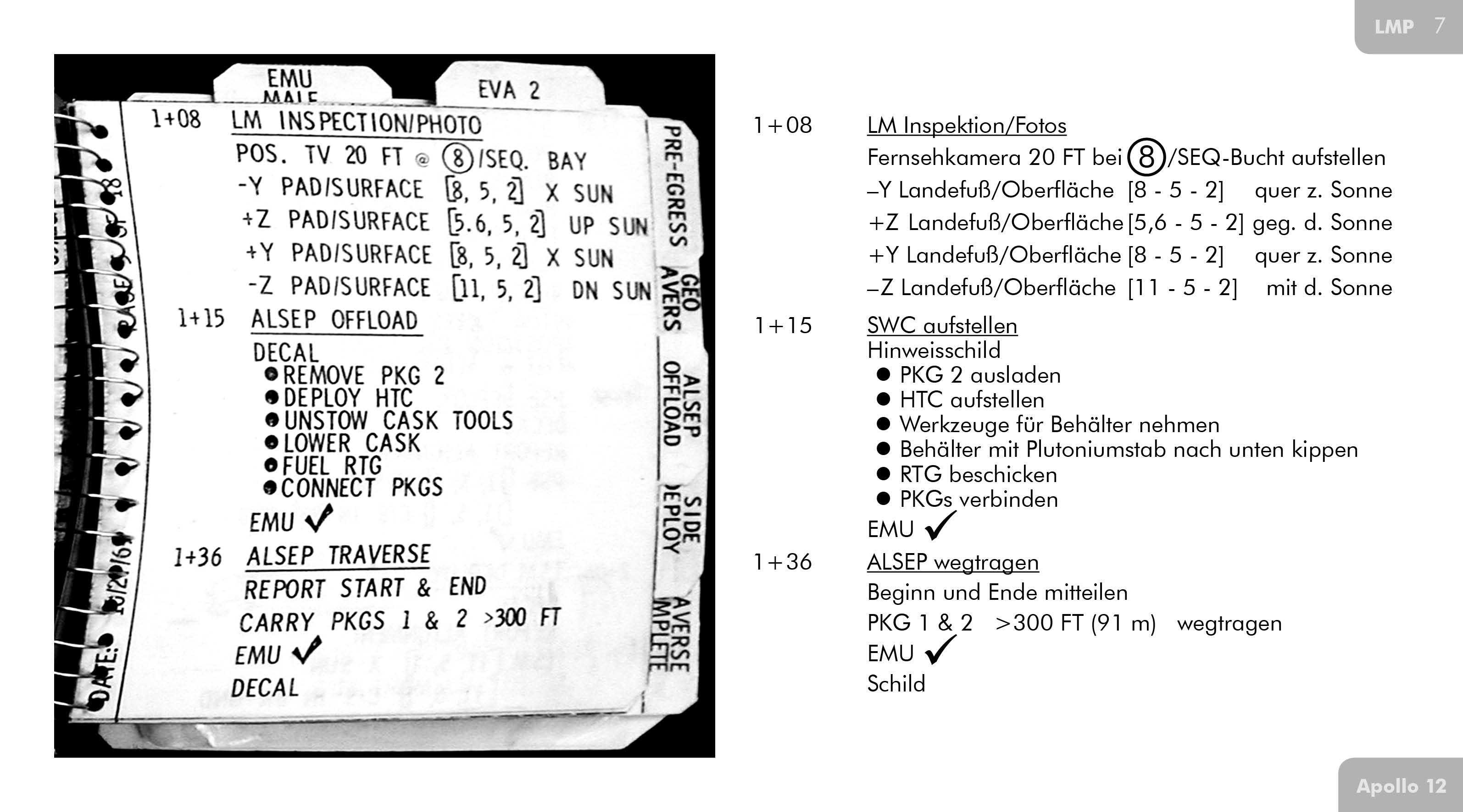 Auf den Seiten SUR-44, SUR-45 und SUR-46 der Checkliste für den Aufenthalt auf der Mondoberfläche bei Apollo 12 (Apollo 12 LM Lunar Surface Checklist) stehen die Einstellungen für alle der insgesamt 36 vorgesehenen Bilder. Die Zahl vor der eckigen Klammer gibt die Richtung anhand des Zifferblatts einer Uhr an. Demnach beginnt Pete die erste Serie in Richtung 2 Uhr (etwa nordwestlich). Innerhalb der eckigen Klammer steht die erste Zahl für die Blende, gefolgt von der Einstellung für die Entfernung und der Anzahl der Aufnahmen, die in der jeweiligen Richtung gemacht werden sollen (hier soll in jede Richtung nur ein Bild gemacht werden). 74FT (74 Fuß bzw. 22,6 m) für die Entfernung bedeutet im Prinzip Unendlich. Mit der Angabe 20 FT bei