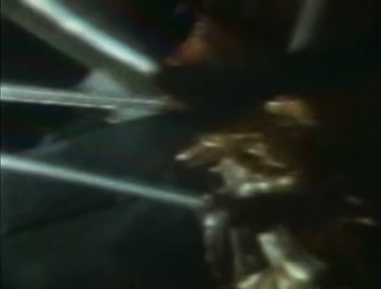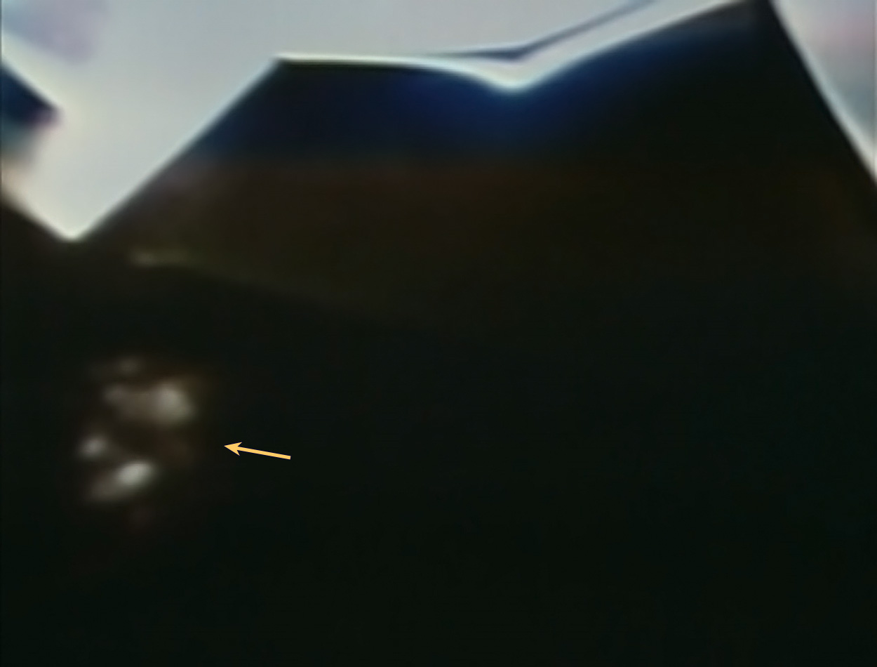 Zuletzt noch S69-31058, ebenfalls vom Training für Apollo 11 und entweder etwas eher während derselben oder bei einer früheren Trainingseinheit aufgenommen. Hier sieht man, dass nur das äußere Segment komplett herausgezogen ist. Neil hat offensichtlich vergessen, das Segment mit den zwei Fingern festzuhalten, oder dabei nicht kräftig genug zugedrückt. Als er dann an der Deckplatte des Empfangstrichters gezogen hat, sind beide Segmente gemeinsam herausgekommen und der innere Teil blieb im äußeren stecken. Vielleicht ist Pete dasselbe passiert. Zum jetzigen Zeitpunkt, während ich dies schreibe, weiß ich nicht, ob Pete beide Segmente wieder zurückschieben musste, oder ob er es geschafft hat, das äußere Segment oben kräftig genug festzuhalten und das innere noch herauszuziehen. Auf jeden Fall konnte er den Antennenstab auf die volle Länge bringen (AS12-46-6750).