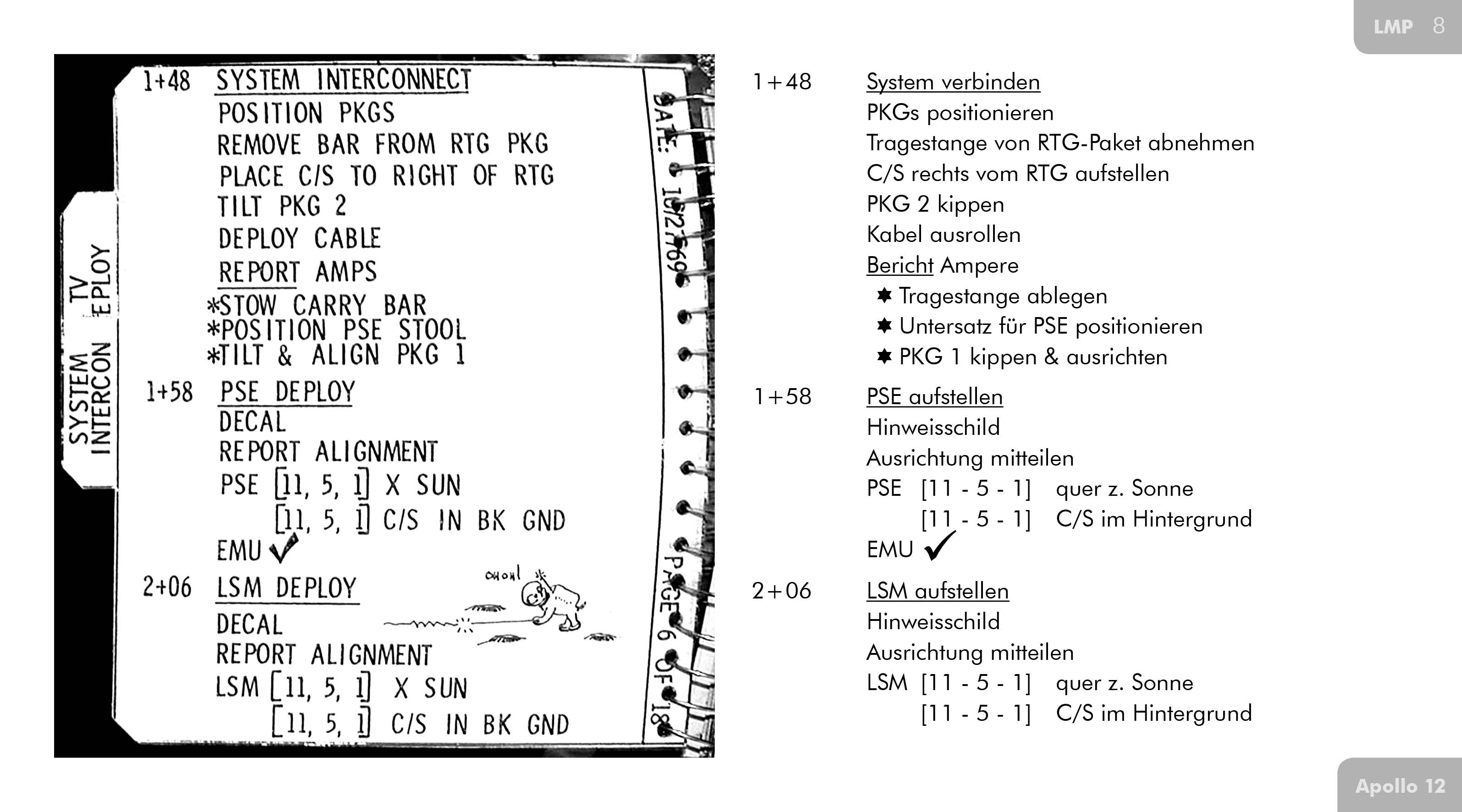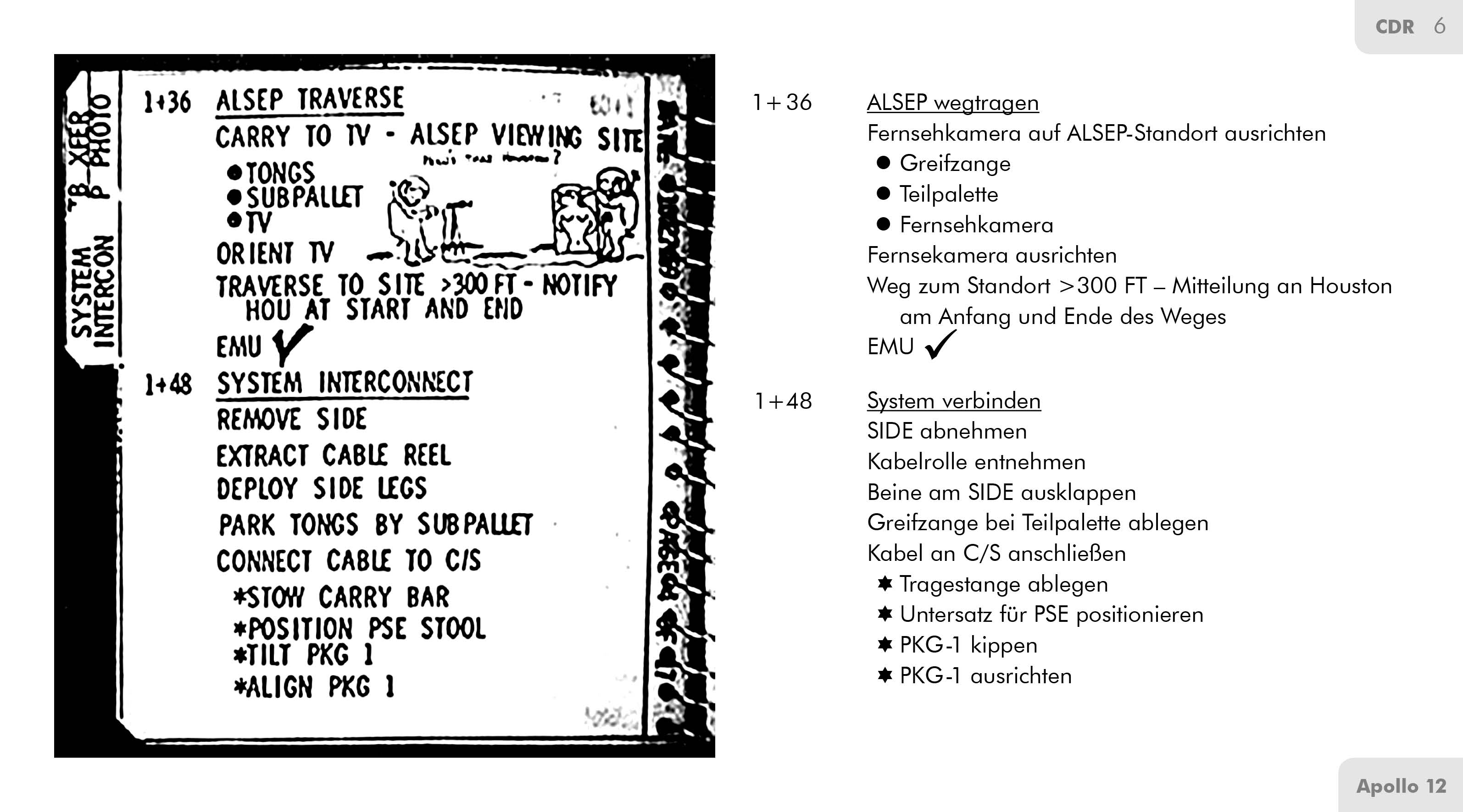 Al erinnert sich an sein Training und rekonstruiert die Anordnung der Geräte aus dem Gedächtnis. Abbildung 3-6 im Missionsbericht (Apollo 12 Mission Report) stellt das Schema für die Aufstellung dar. In seiner Checkliste ist er jetzt auf der achten Seite, oben beginnend mit 1+48 System verbinden. Auf den Seiten 44 und 45 im Ablaufplan der Arbeiten auf der Mondoberfläche für Apollo 12 (Apollo 12 Lunar Surface Operations Plan) sind die geplanten Schritte dazu detailliert aufgelistet.