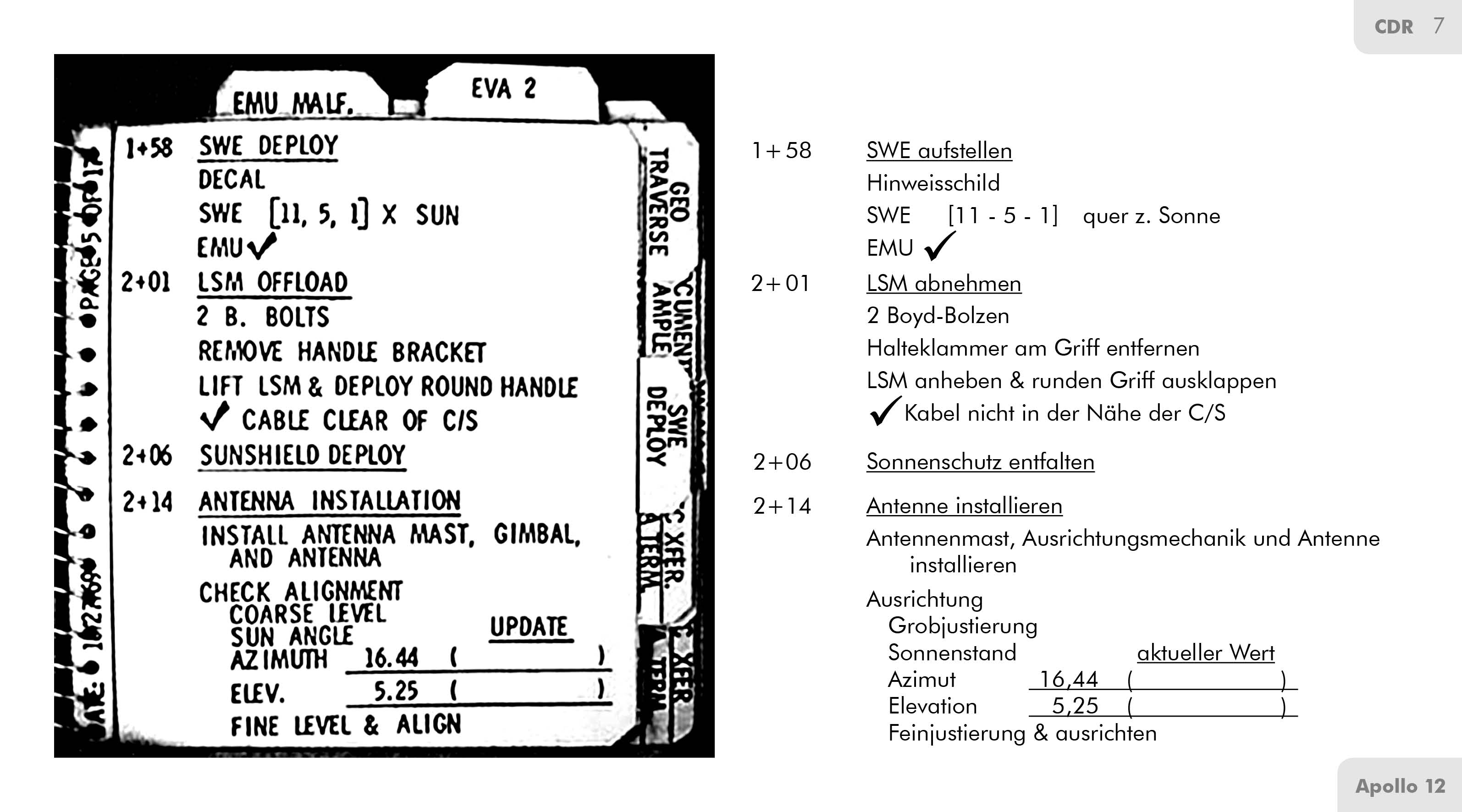 ALSEPApollo Lunar Surface Experiments Package hatten, nur sehr schwer lesen. Soweit ich mich erinnere, beim Training war es schwarze Schrift auf silbernem Grund. Auf dem Mond war das kaum zu lesen. Das grelle Licht wurde vom silbrigen Hintergrund reflektiert und die schwarze Schrift war nicht mehr zu erkennen. Da standen die einzelnen Schritte drauf, um das ALSEP