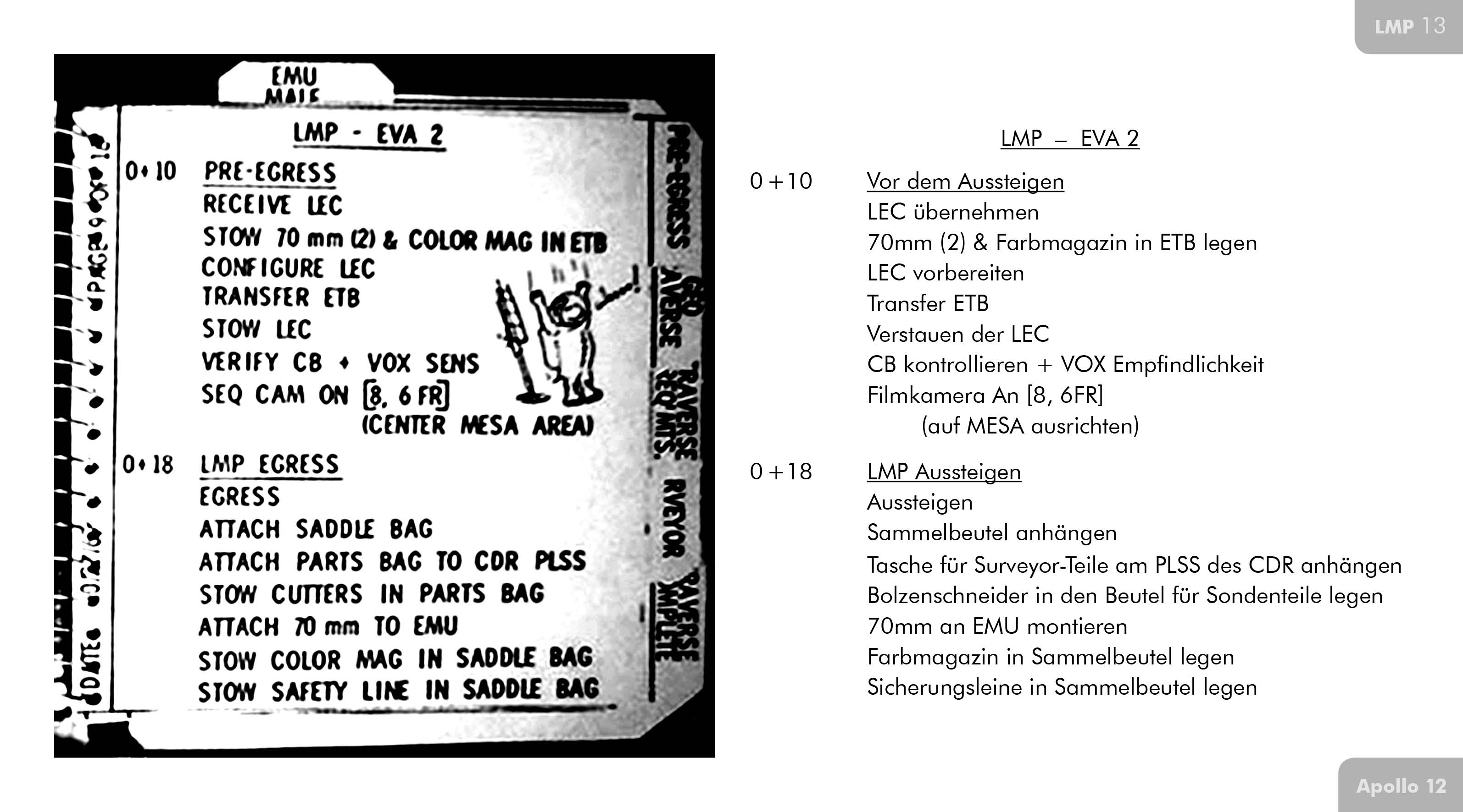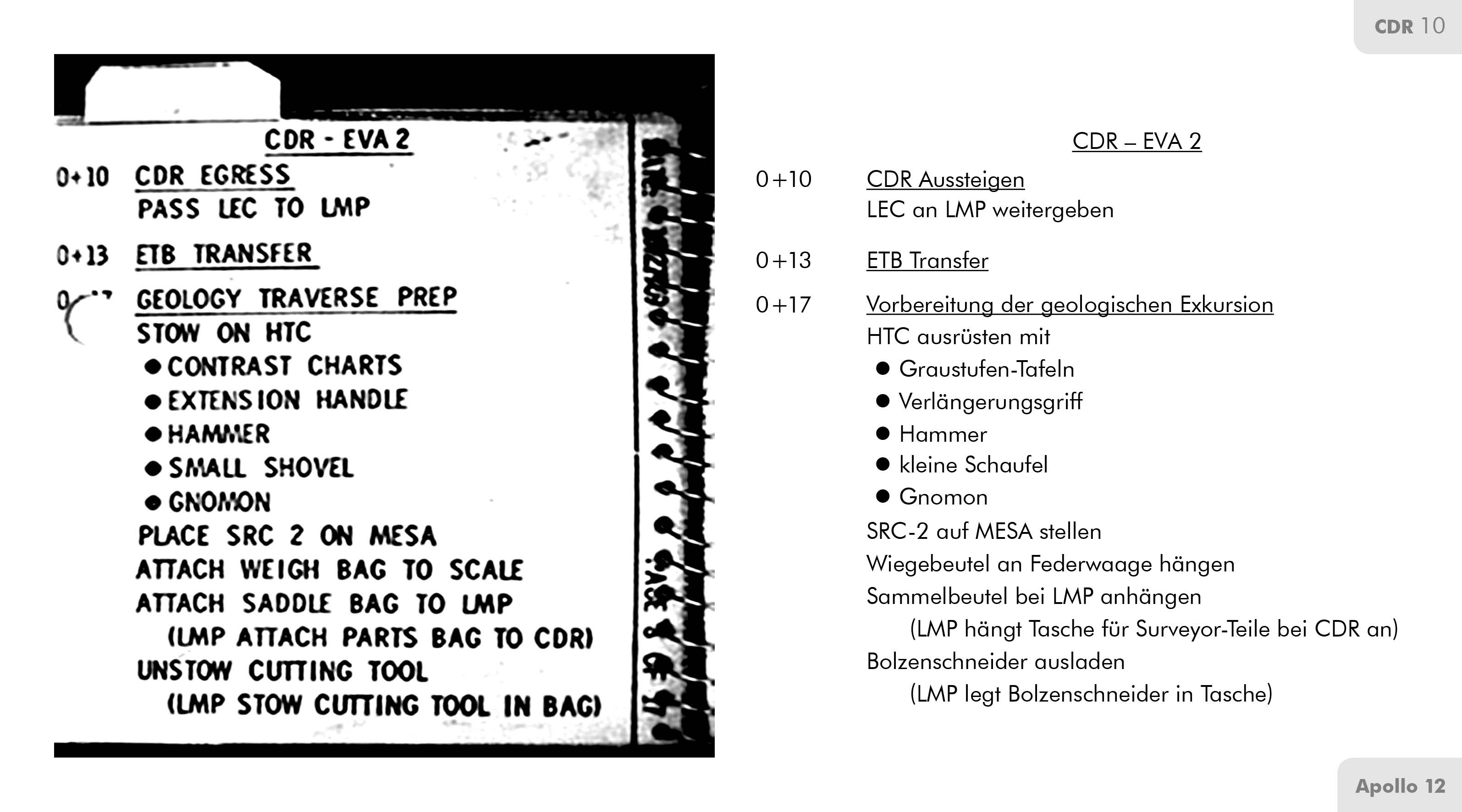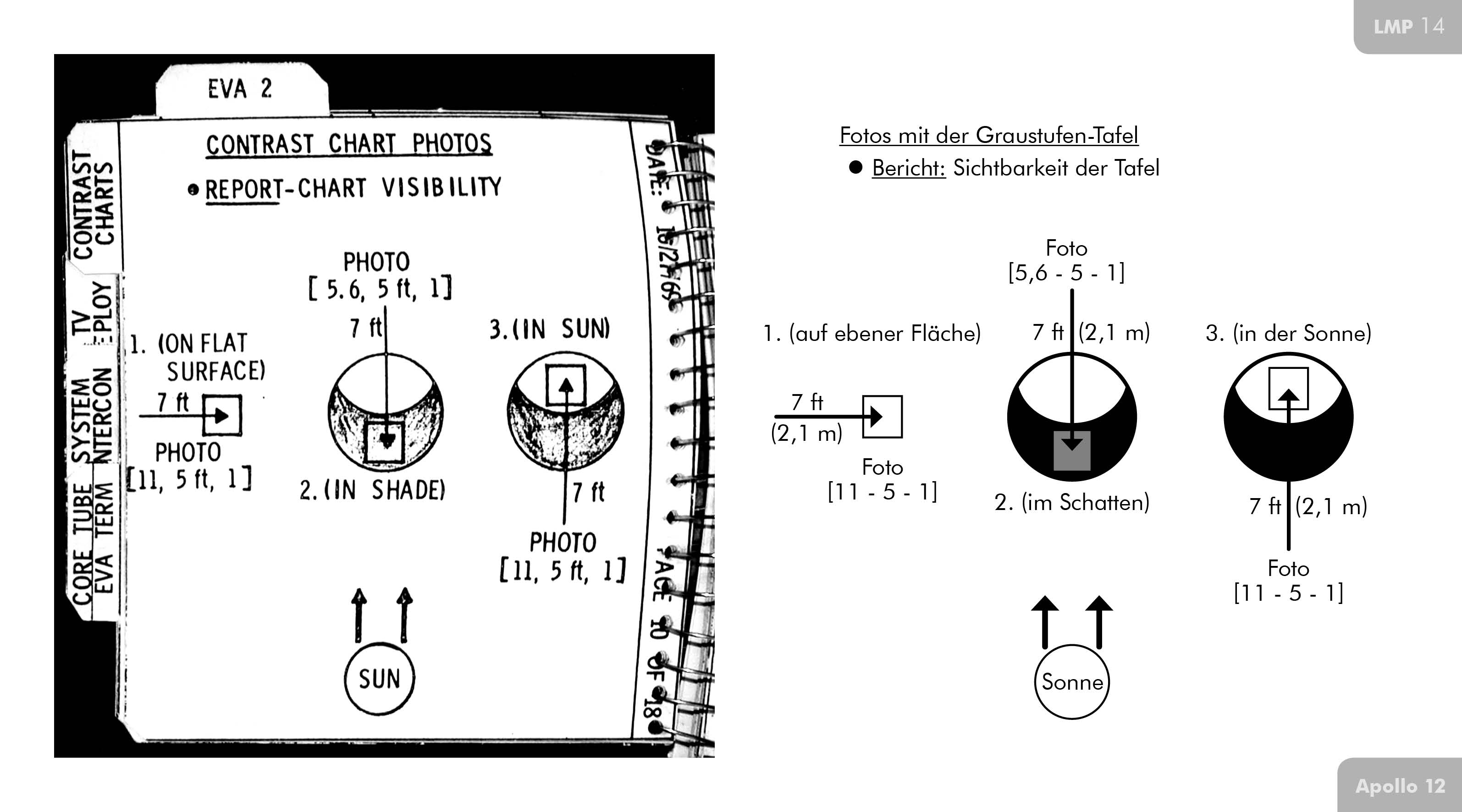 Conrad (Technische Nachbesprechung, ): Wir hatten drei (Graustufen-Tafeln), die an der Ecke des Tischs hingen. Als ich während der ersten EVA die erste LiOH