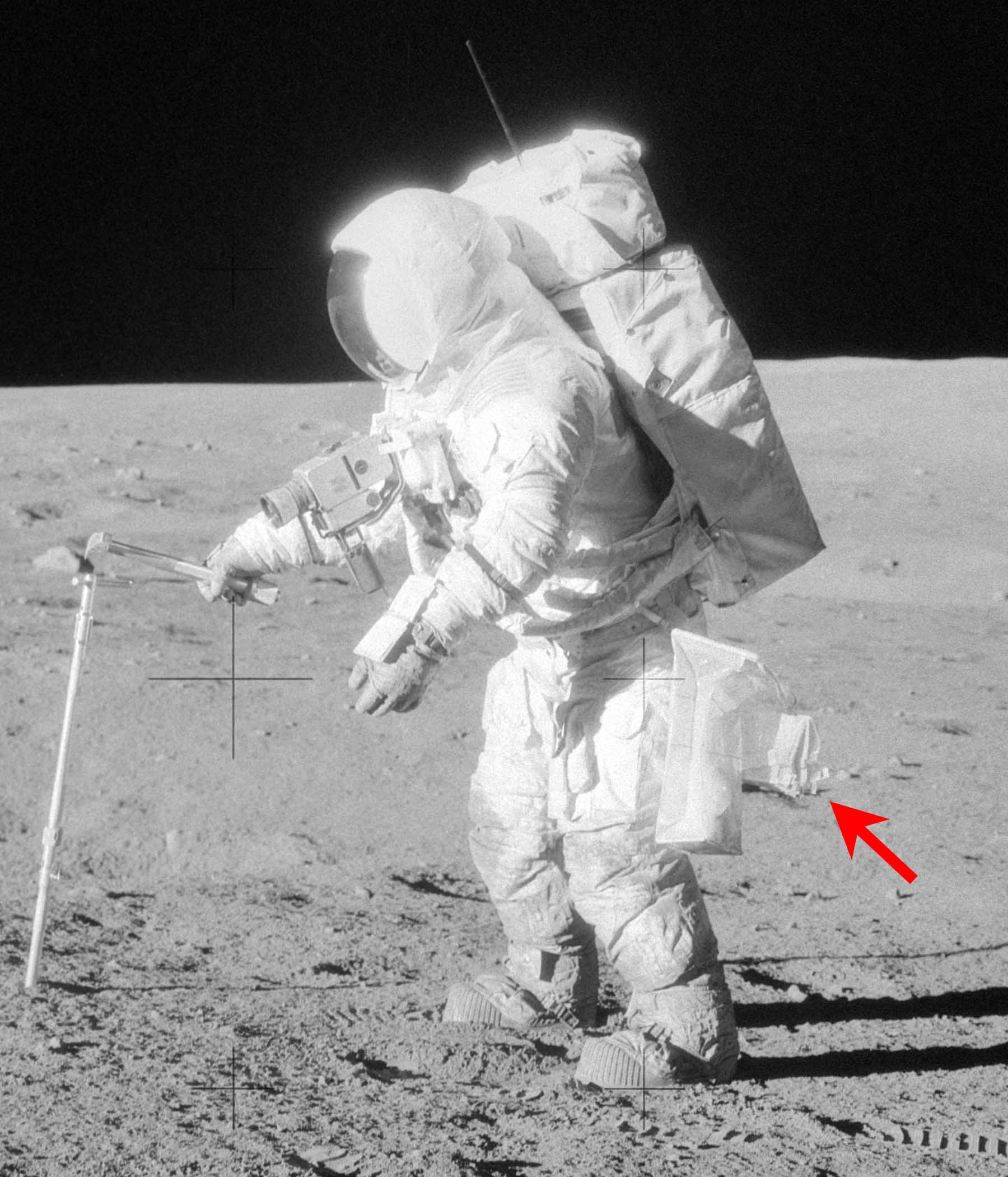 ETBEquipment Transfer Bag legt. Mit dem Farbfilm sollte im Krater Surveyor fotografiert werden. Bevor sie zu ihrer Exkursion aufbrechen, kommt das Magazin in den Sammelbeutel an der Hüfte, wird jedoch nie verwendet. Tatsächlich befindet es sich nach wie vor im Sammelbeutel – oder was davon noch übrig ist – im Landefuß unter der Leiter.
