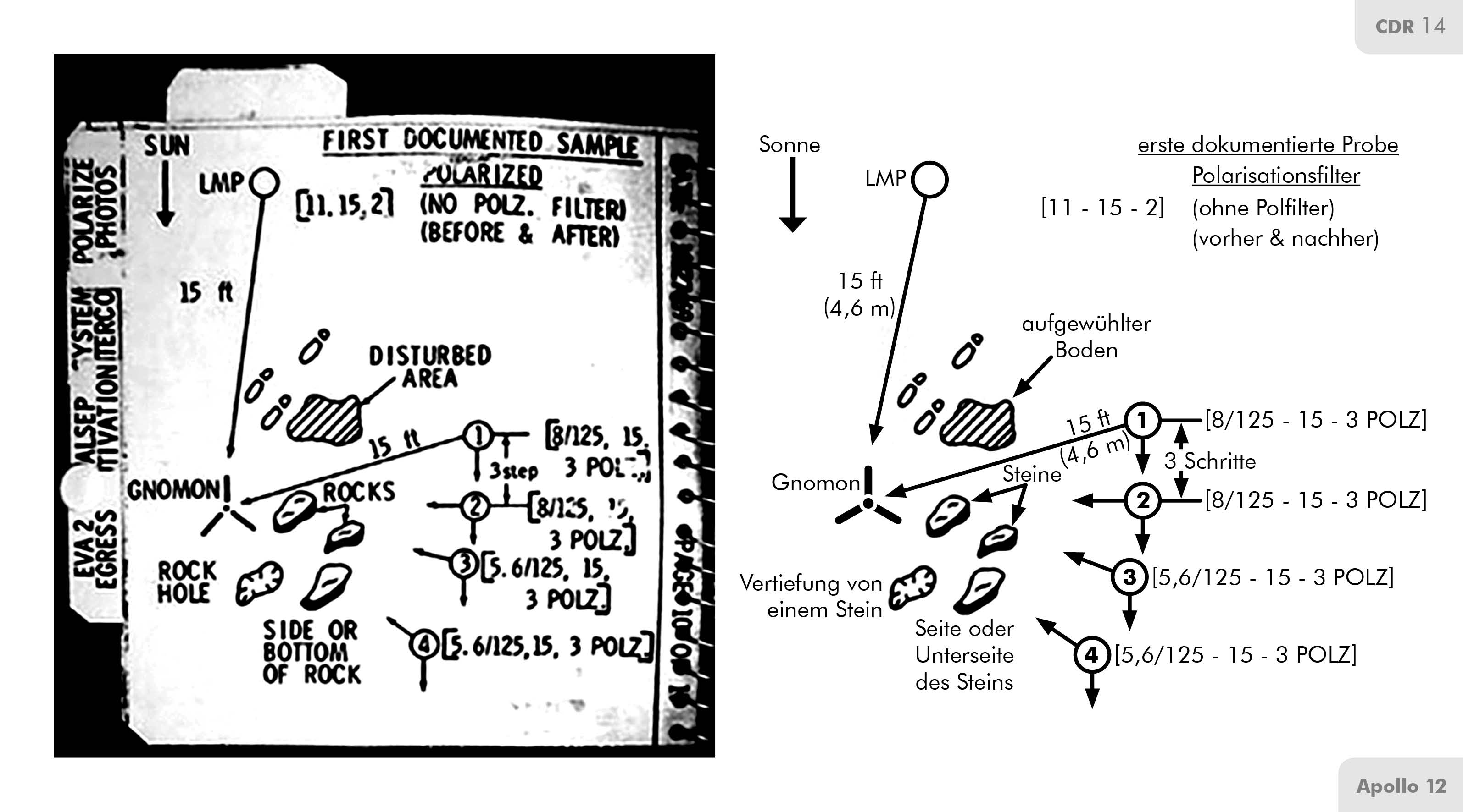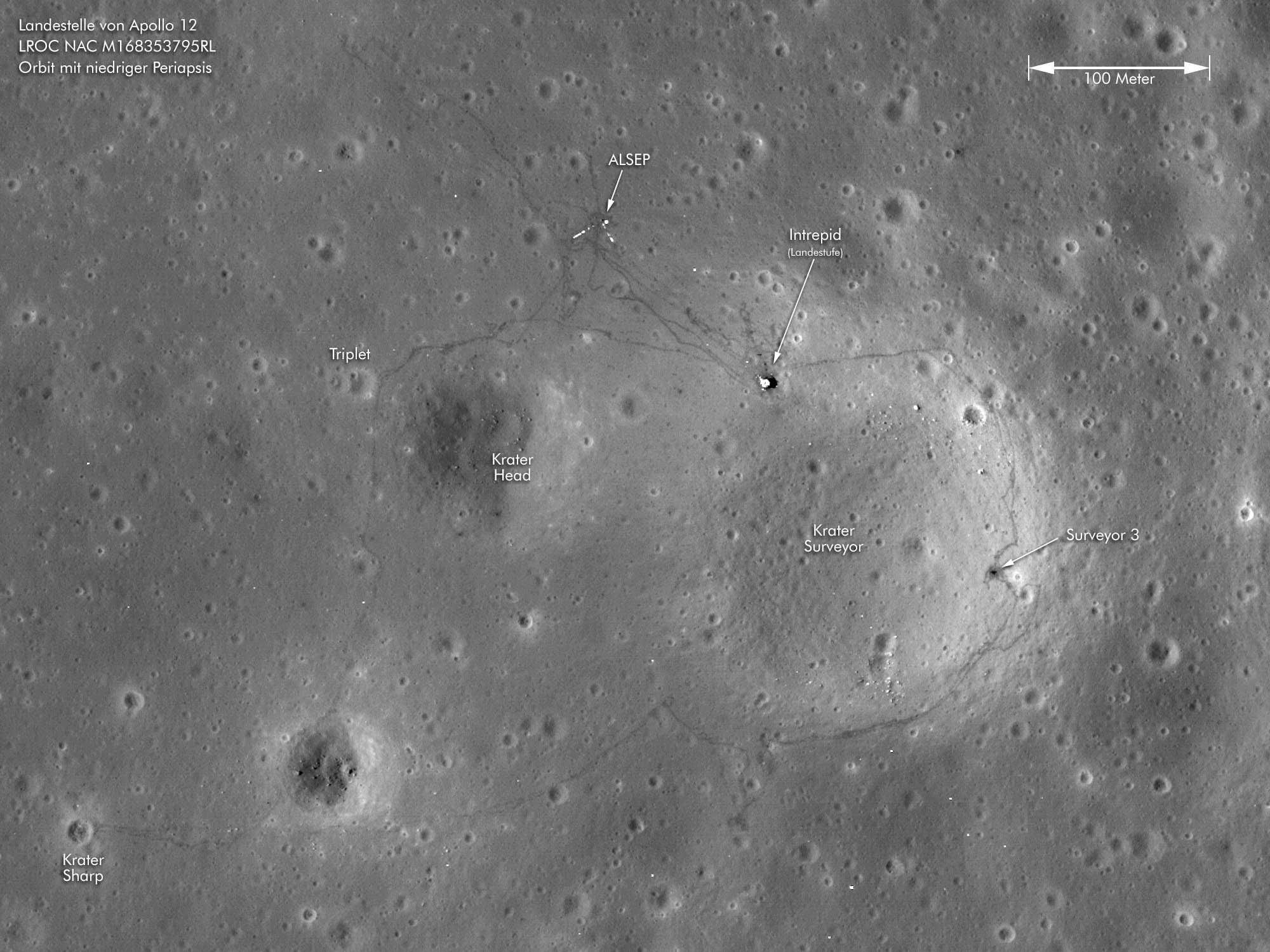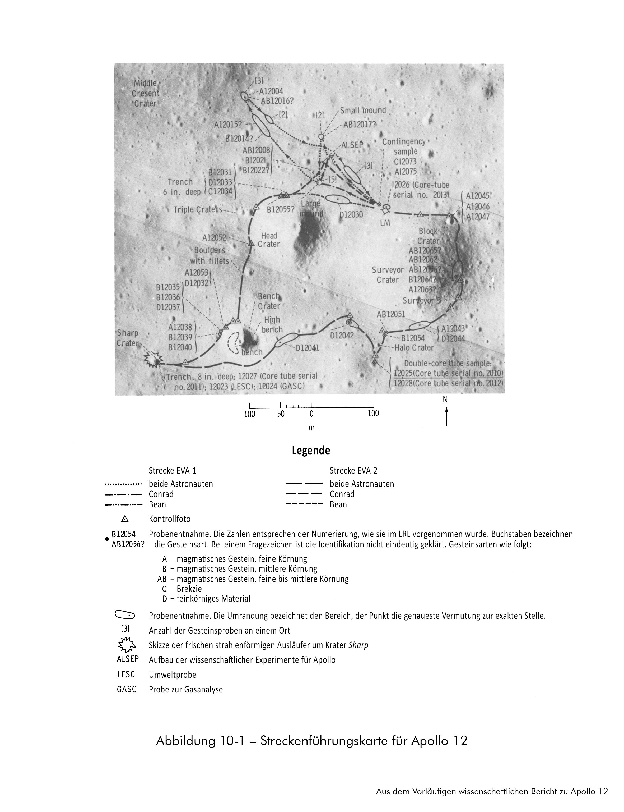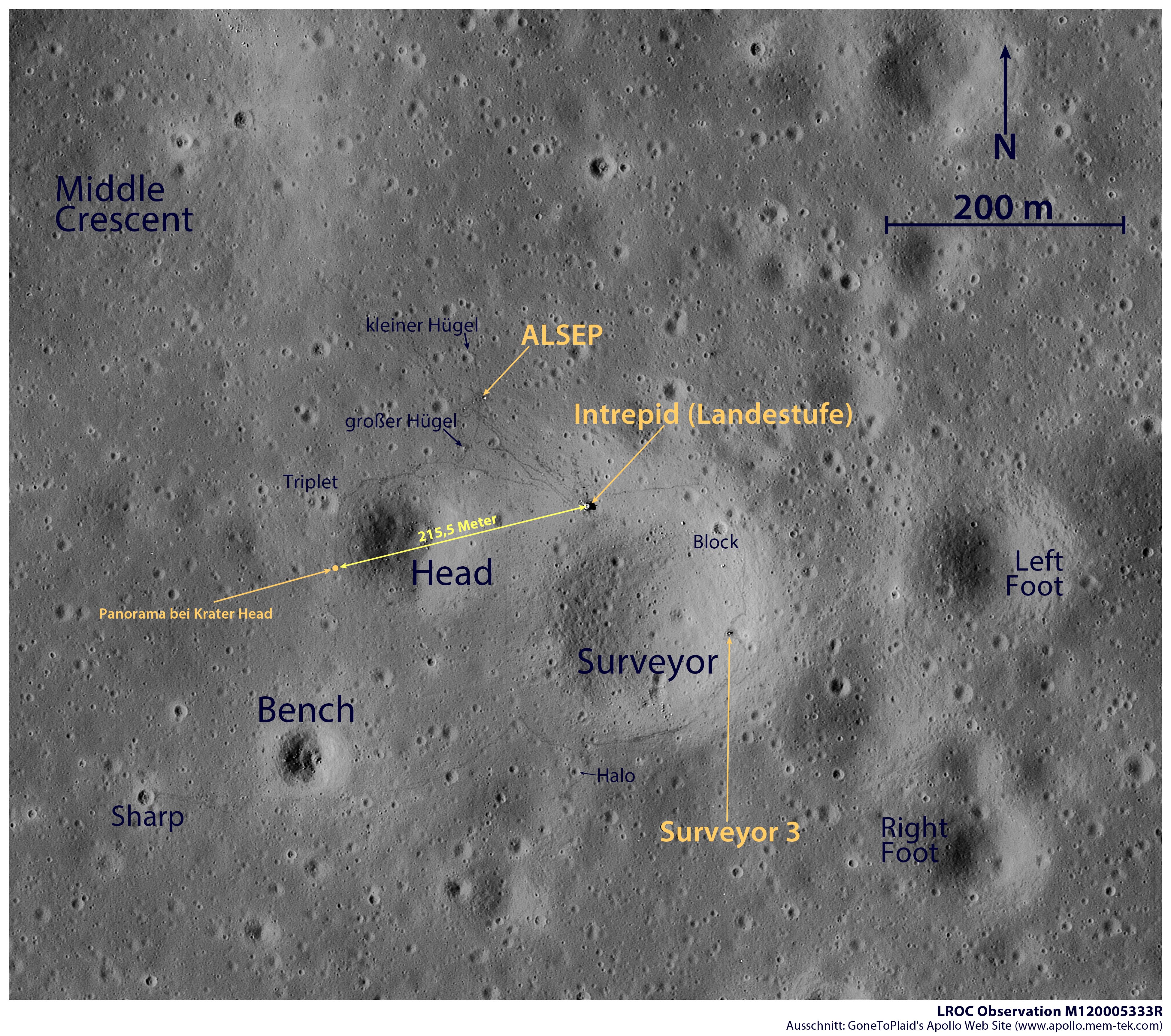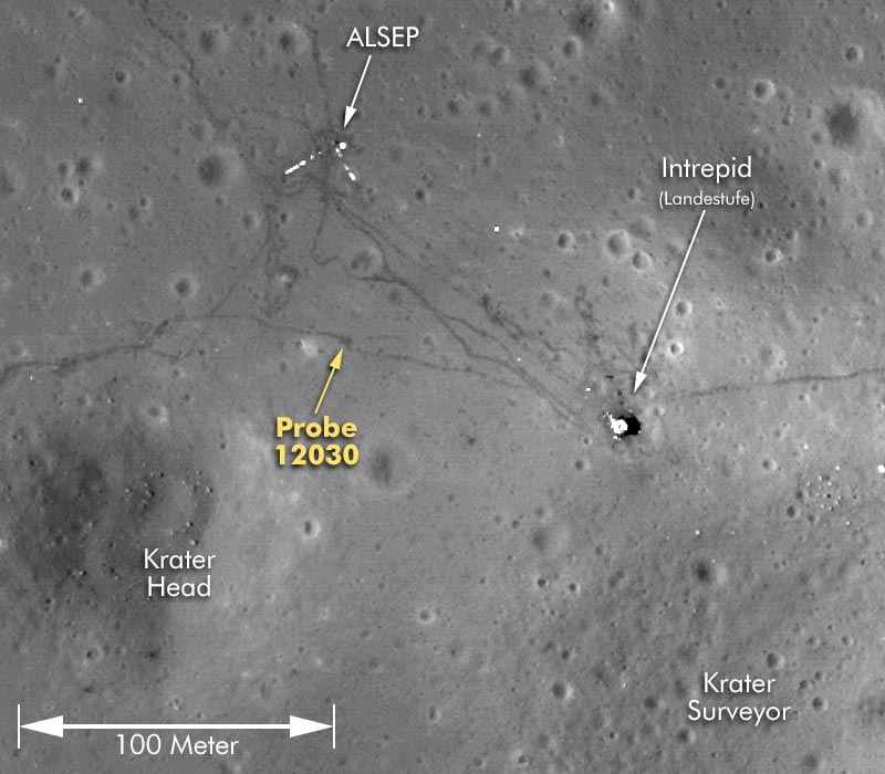 LROCLunar Reconnaissance Orbiter Camera sind die Spuren gut zu erkennen, die Al dort hinterlassen hat. Auf der planimetrischen Karte (8 Mb) liegt die Stelle bei den Koordinaten R.05/ 13.43. Der im Vorläufigen wissenschaftlichen Bericht zu Apollo 12 (Apollo 12 Preliminary Science Report) auf Abbildung 10-1 (Digitalisierung: Ulrich Lotzmann) angenommene Bereich für Probe 12030 entspricht ziemlich genau dieser Stelle. Al ist ca. 80 Meter vom LM