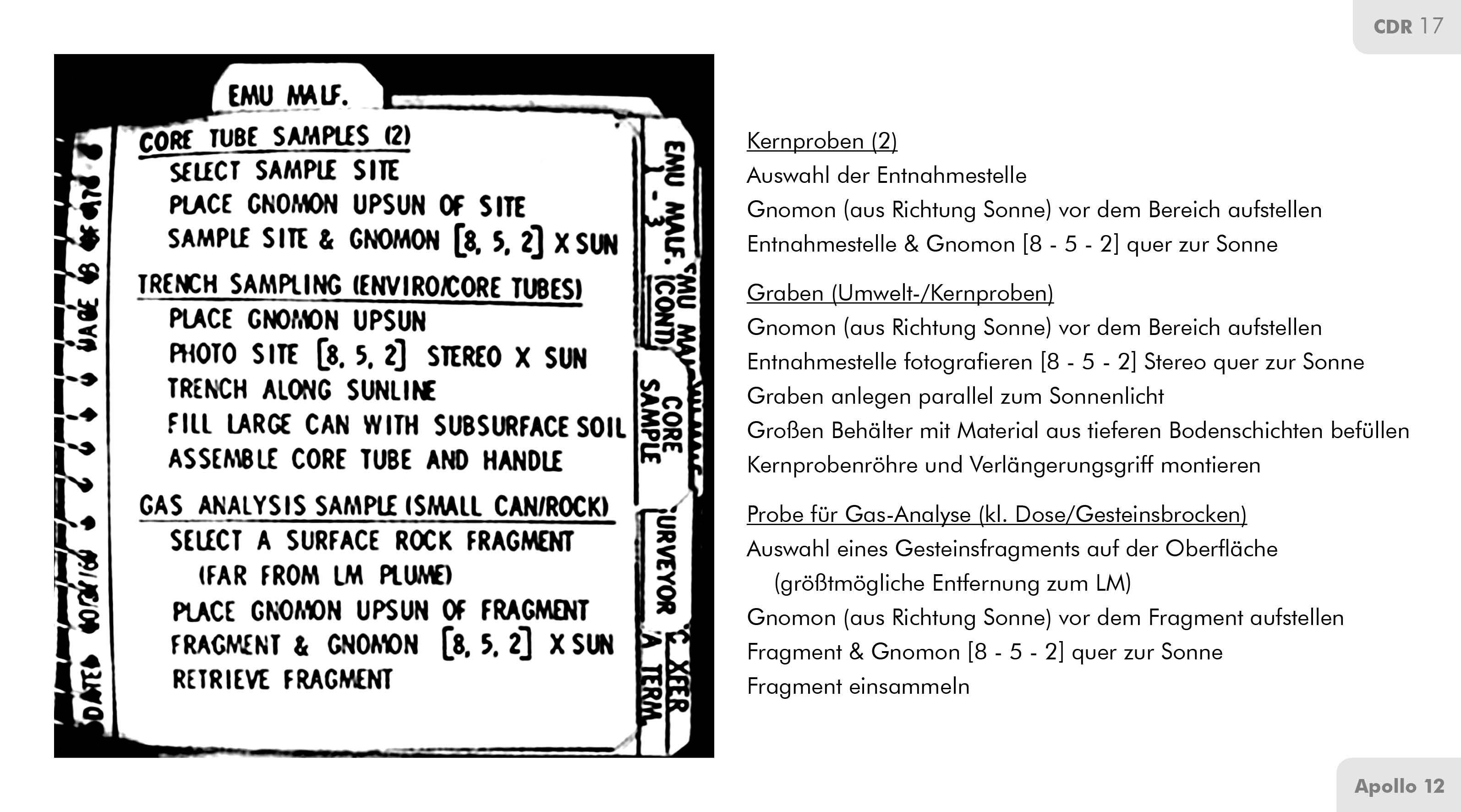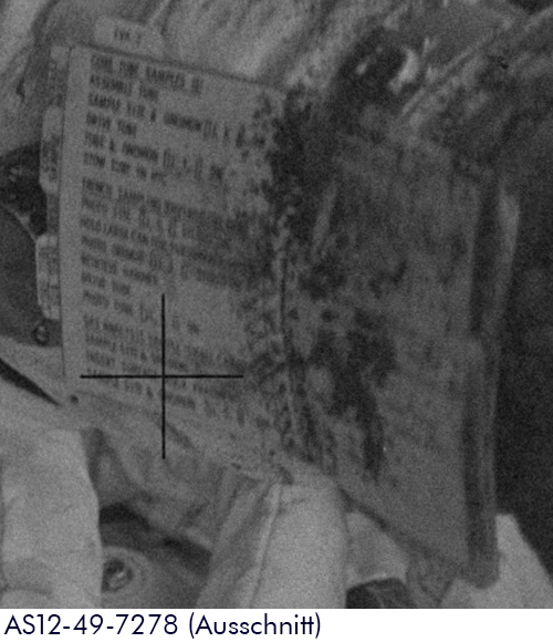 Bean: Als wir das auf der Erde trainiert haben, sogar in vulkanischen Gegenden, schaute man in den Beutel und hatte die glänzenden Chromteile gleich in der Hand. Auf dem Mond waren die Staubpartikel so klein und adhäsiv, dass alles nur noch grau aussah. Man musste richtig herumwühlen, bis etwas auftauchte – nichts glänzendes, oder vielleicht glänzte es an einigen Stellen. Sie waren kaum zu erkennen. Auf der Erde musstest Du den Beutel nicht halten. Ich brauchte nur reinzusehen und habe auf Anhieb alles gefunden. Durch diesen Staub waren die zwei kleinen Teile (Gasprobenbehälter und Selbstauslöser) wirklich schwer zu unterscheiden. Staub auf der Erde haftet lange nicht so stark.