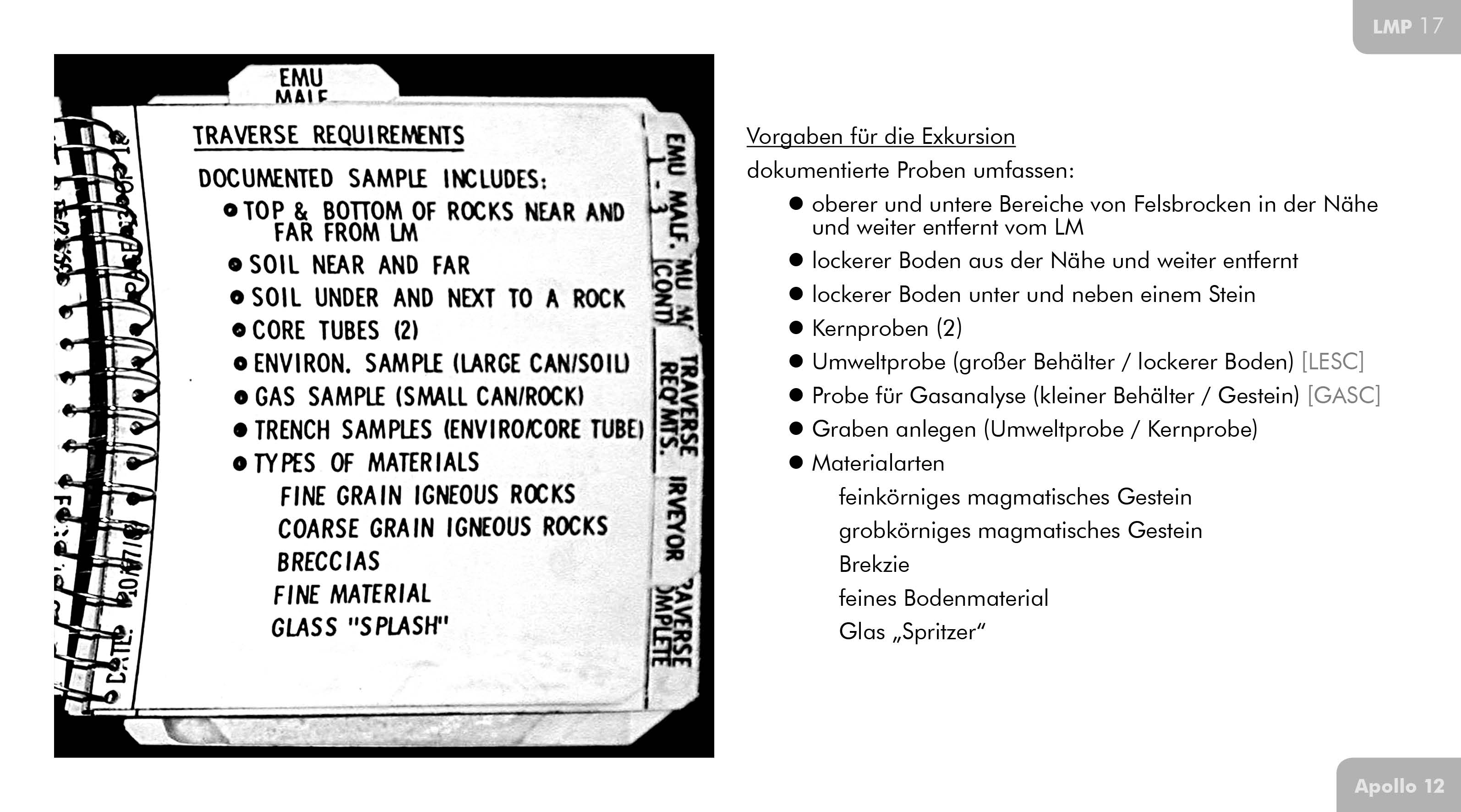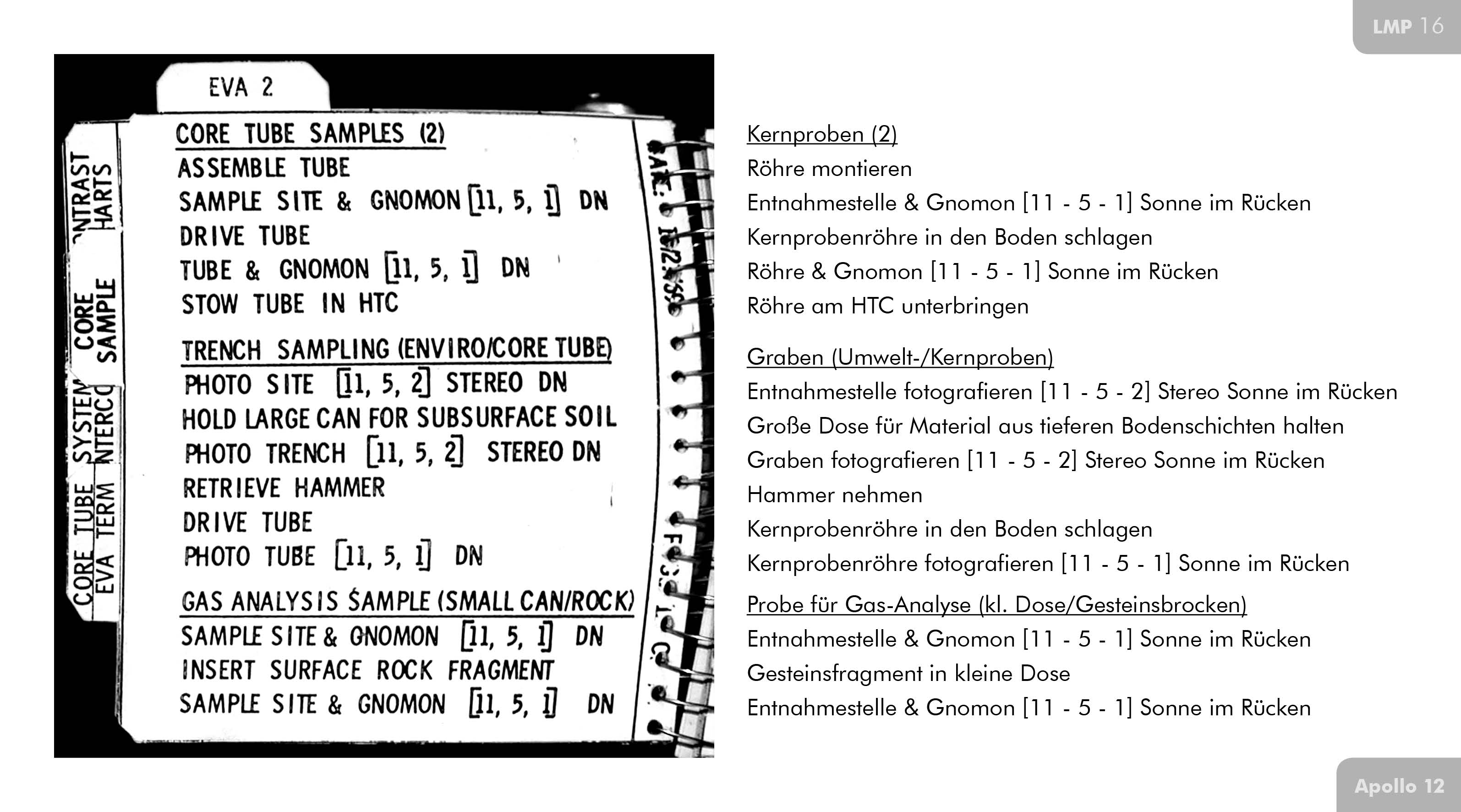 Al konnte sich auch nicht mehr an zwei Behälter erinnern. Offensichtlich hatte man in Houston gleichermaßen Probleme, die Aktivitäten bei Krater Sharp zu verfolgen. Denn den Leuten in der Bodenstation schien ebenfalls nicht klar zu sein, dass Pete und Al die Umweltprobe bereits genommen hatten, die Gasanalyseprobe aber noch ausstand.
