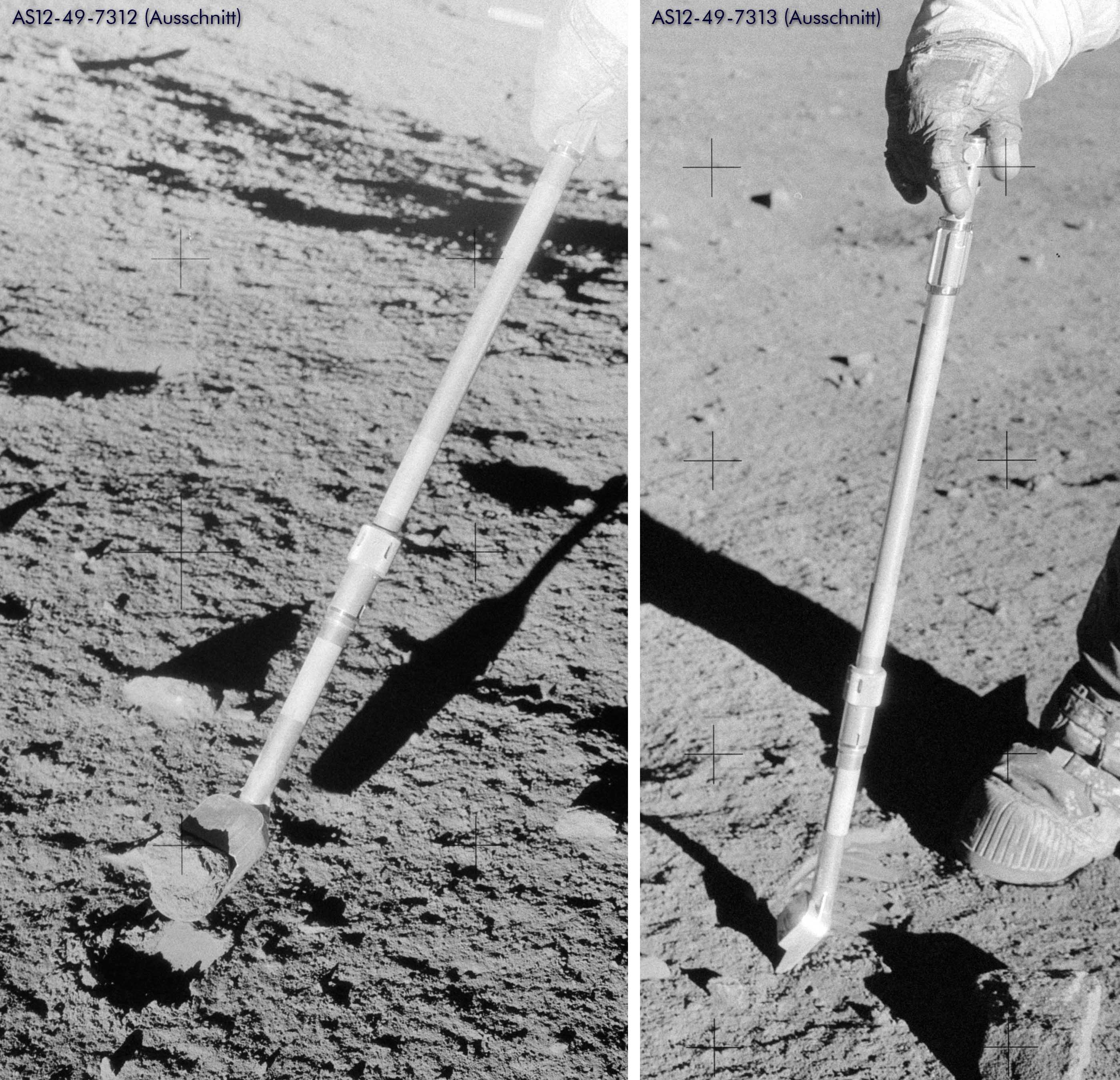 Conrad: Okay. Hab einen Stein. (fotografiert eine Panorama-Bildserie) Fünf Bilder. (Blende) 8. Das da muss Krater Sharp sein. Die verdoppelte Kernproberöhre treiben wir in …