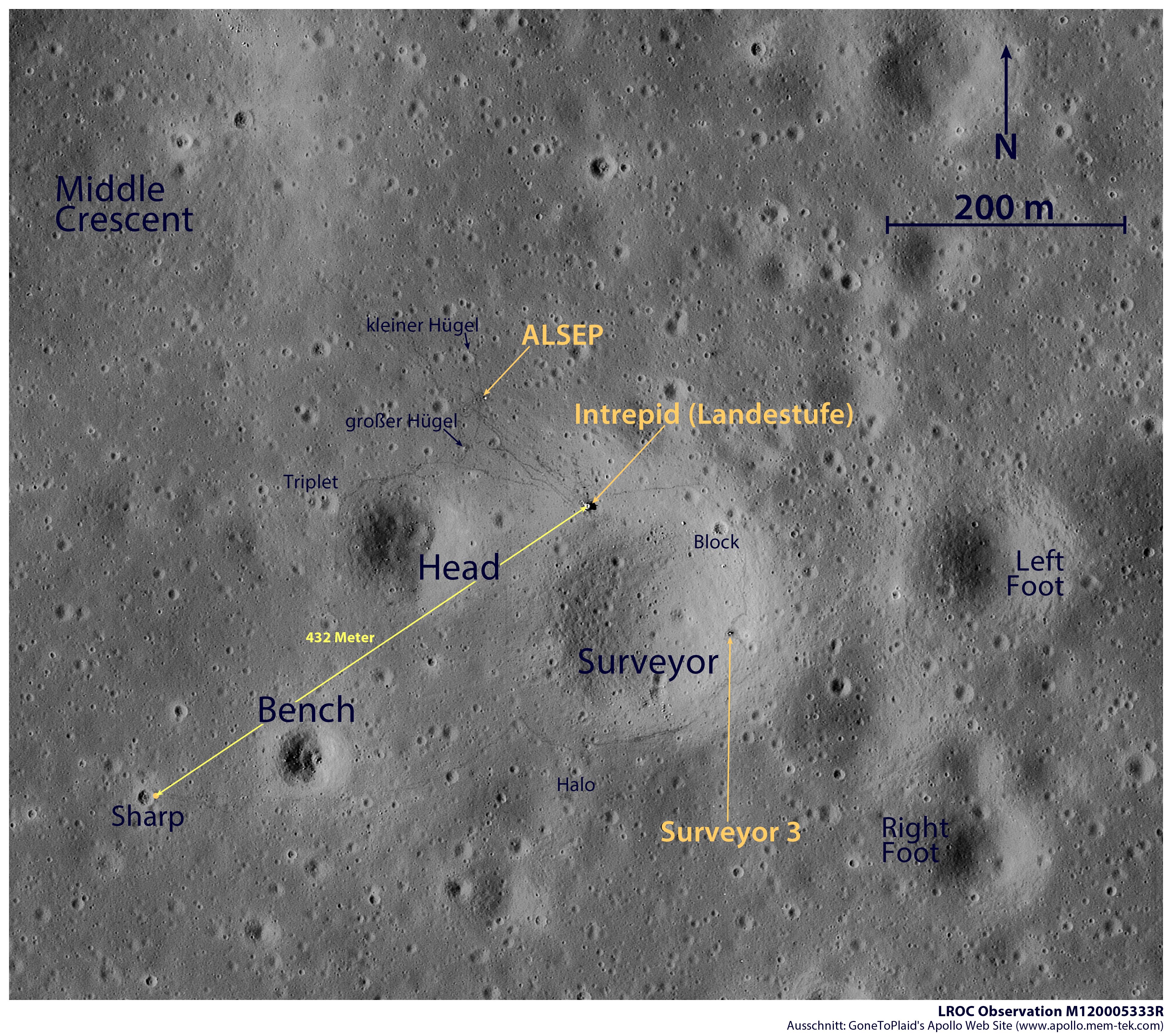 Conrad: Ich sage hier auch nichts davon, dass ich Krater Bench sehen kann. Aber um Sharp zu finden, habe ich mich sicher an irgendeinem Objekt orientiert, dass ich sehen konnte und von dem ich wusste, wo es liegt. Das muss Bench gewesen sein.