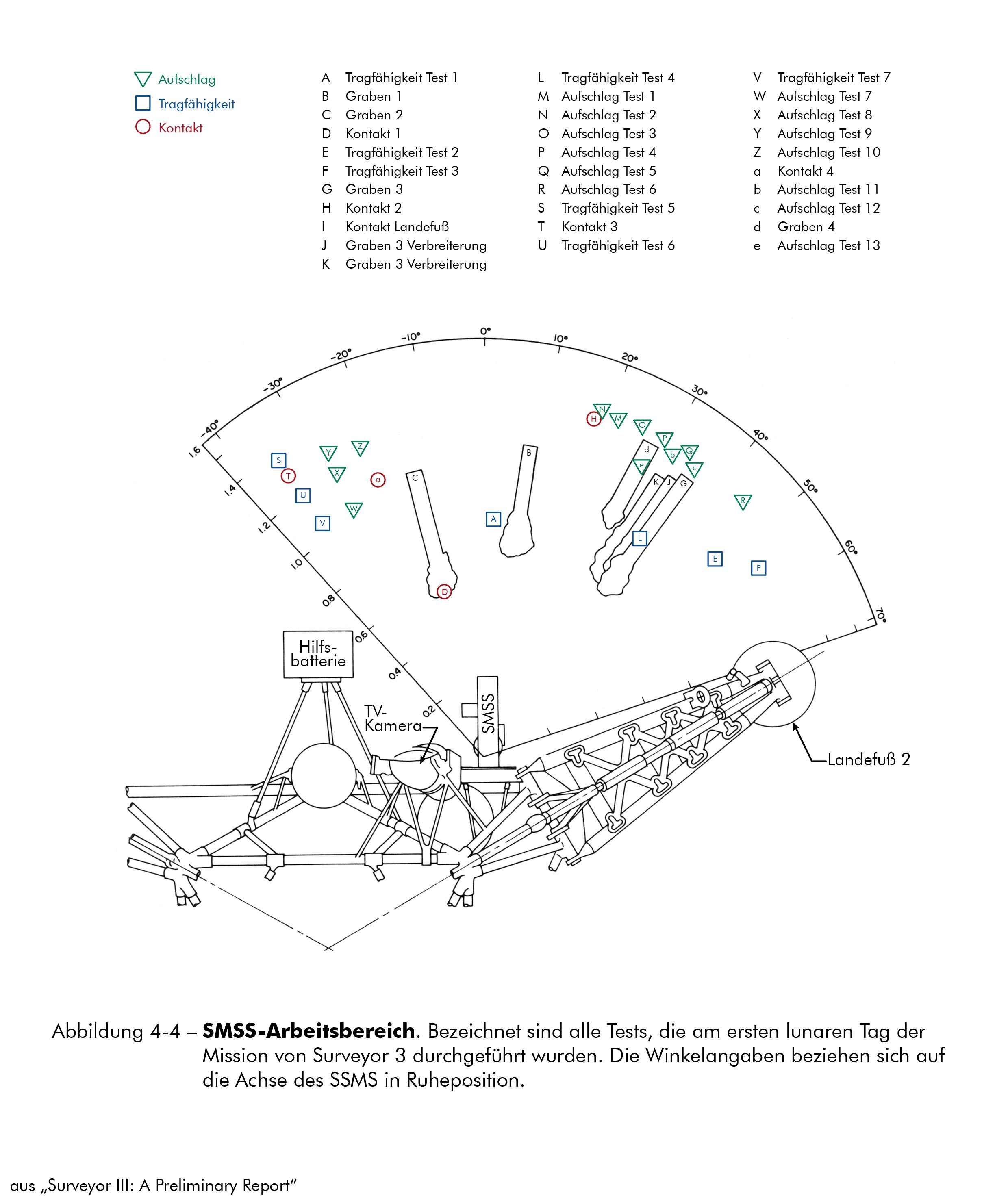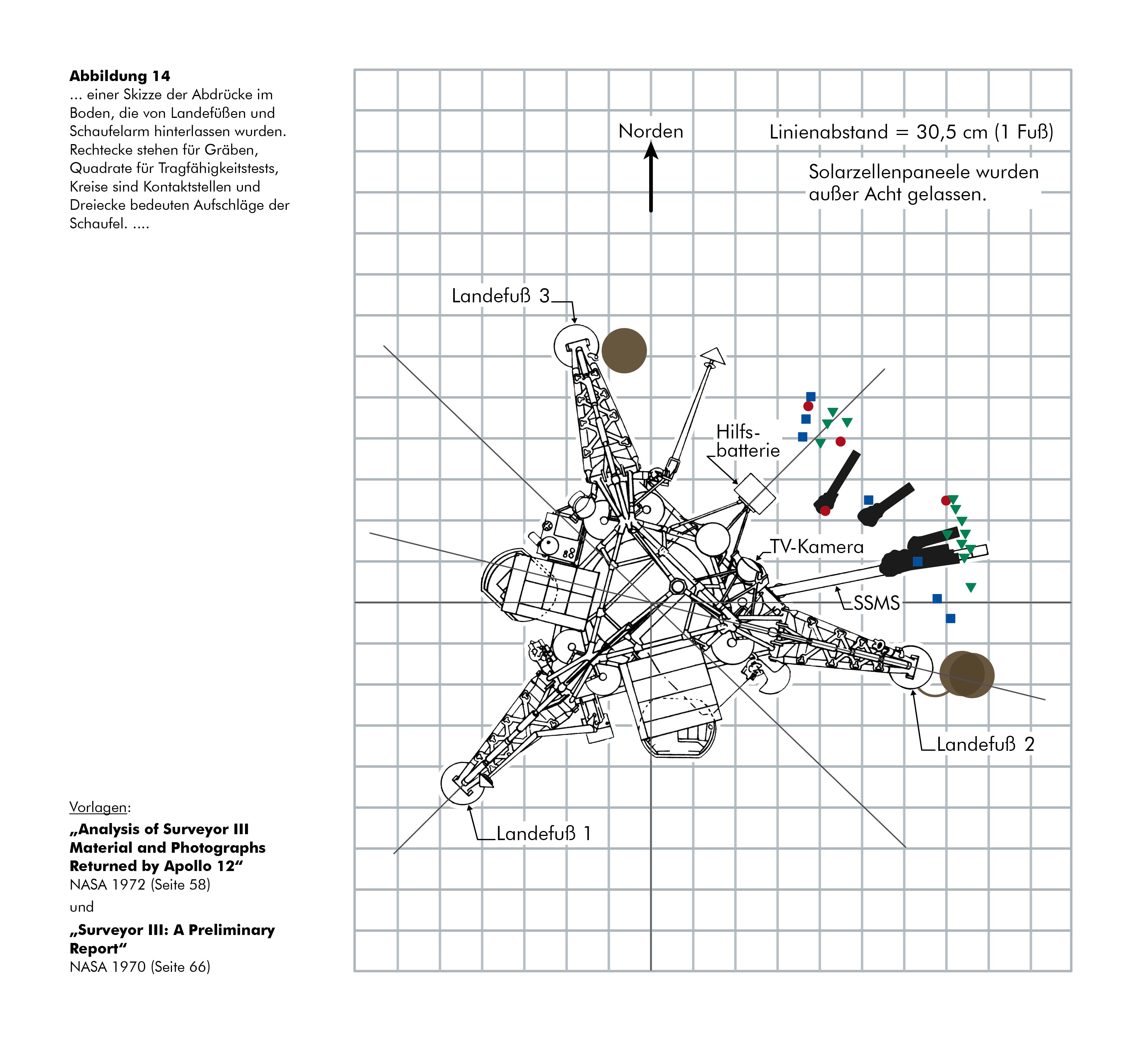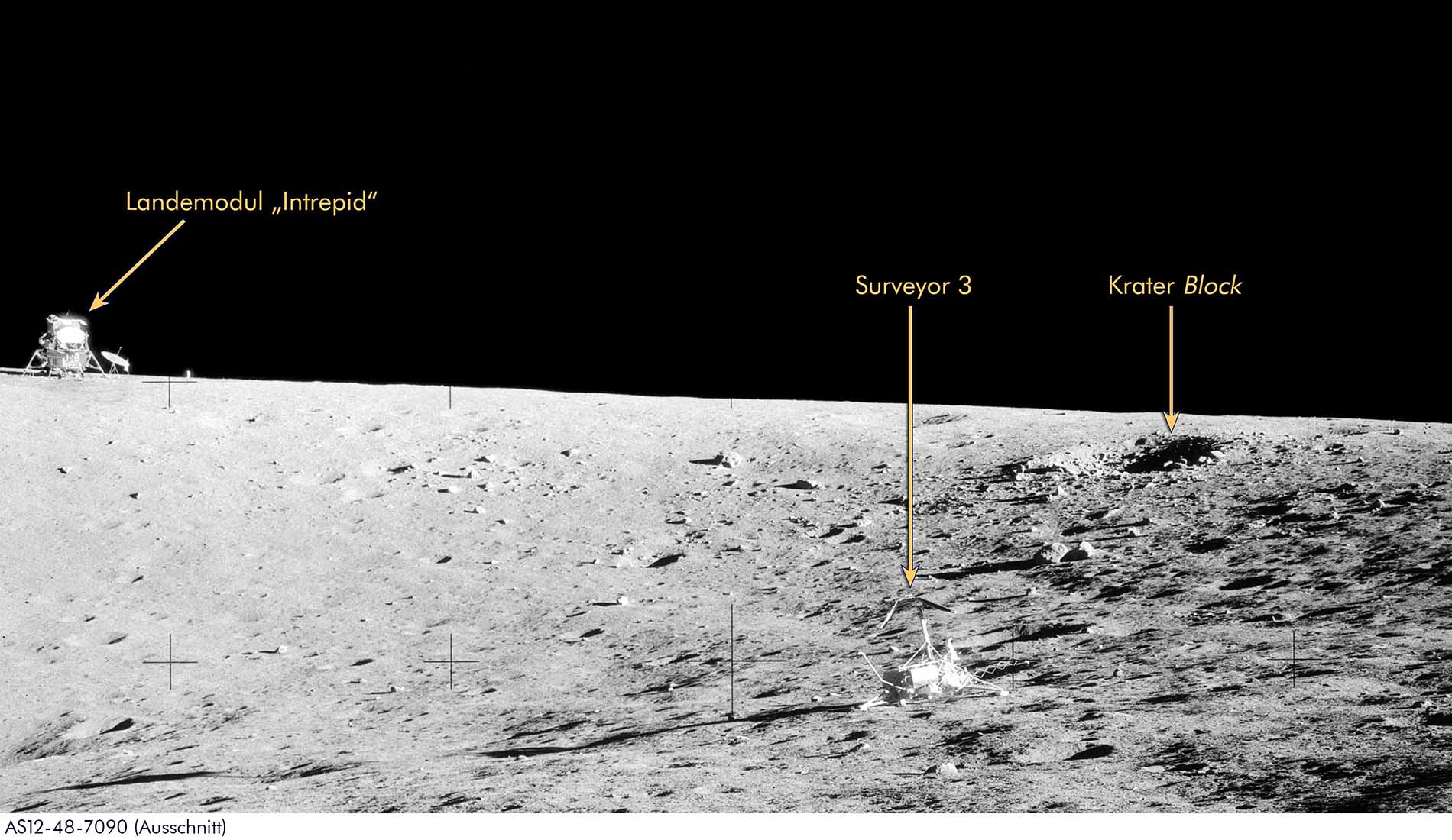 Conrad: So wird es verweht und etwas davon verteilt sich auf der Südseite. Wir sind hier entlanggeflogen (an der Nordseite des Kraters), die Fernsehkamera befand sich an der Nordostseite und ich kann mir denken, wie der Staub dort hingekommen ist, wie er sich auf dem Spiegel abgesetzt hat. Auch wenn ich es nicht sicher sagen kann. Mich wundert etwas anderes … Der Dreck blieb überall haften. Selbst wenn man gegen die Behälter klopfte, er fiel nicht ab. Dann, in der Kabinenatmosphäre und bei Schwerelosigkeit, ist der Mist plötzlich überall herumgeflogen. Er hatte sich gelöst. Dafür hatten wir keine Erklärung.