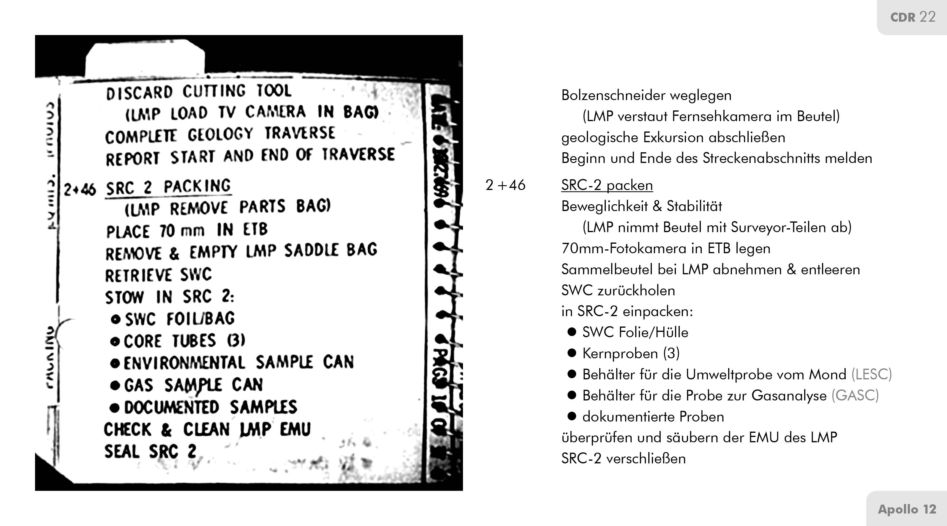 Bean: Nein, steht nicht drin. Aber ich erinnere mich jetzt daran. In den Surveyor-Bildern konnten sie drei oder vier Steine sehen. Wir sollten die Steine mitbringen, die sie sich jahrelang angeschaut haben. (Pause) In meiner Checkliste (22. und 23. Seite) finde ich keinen Eintrag dazu.