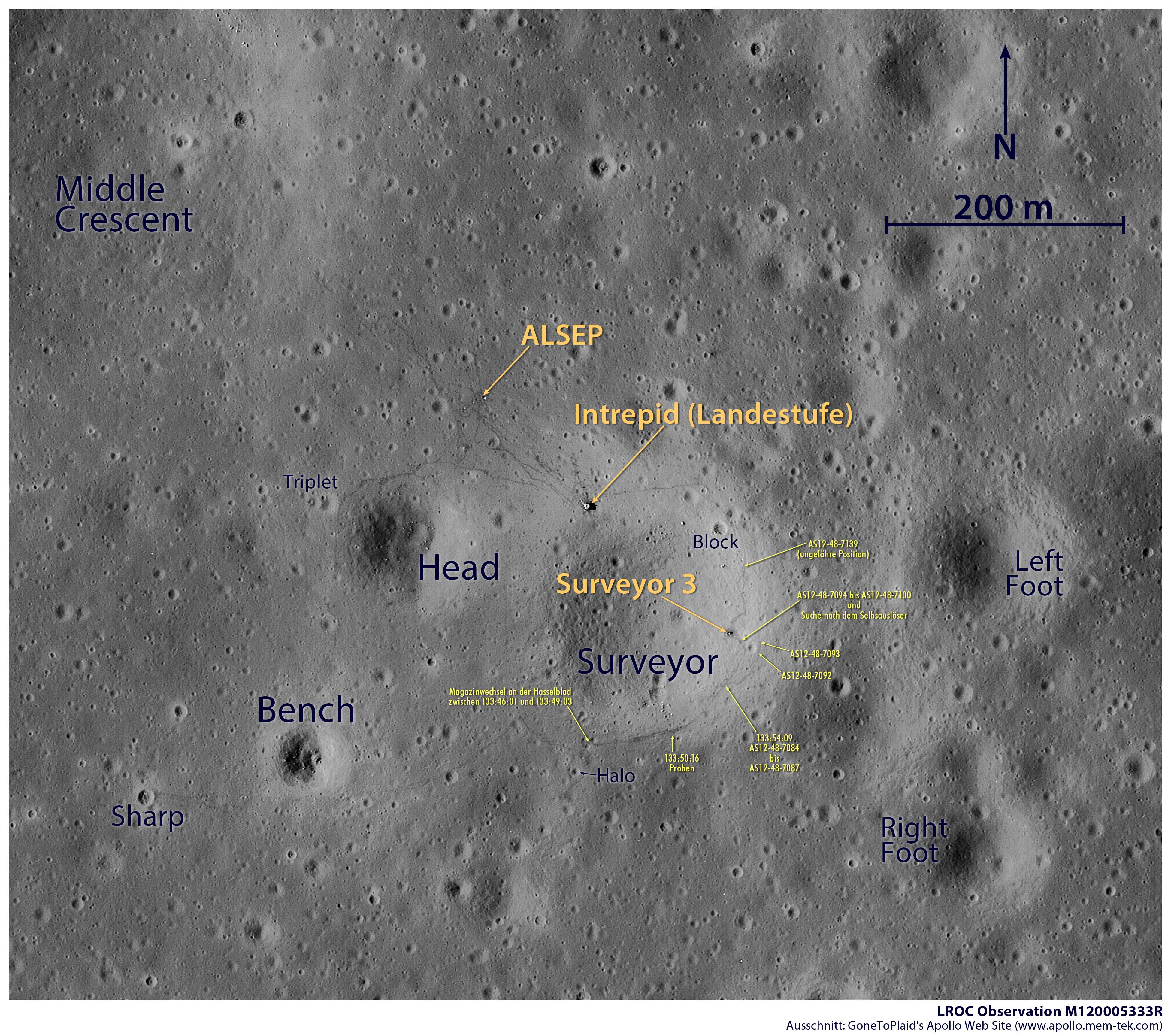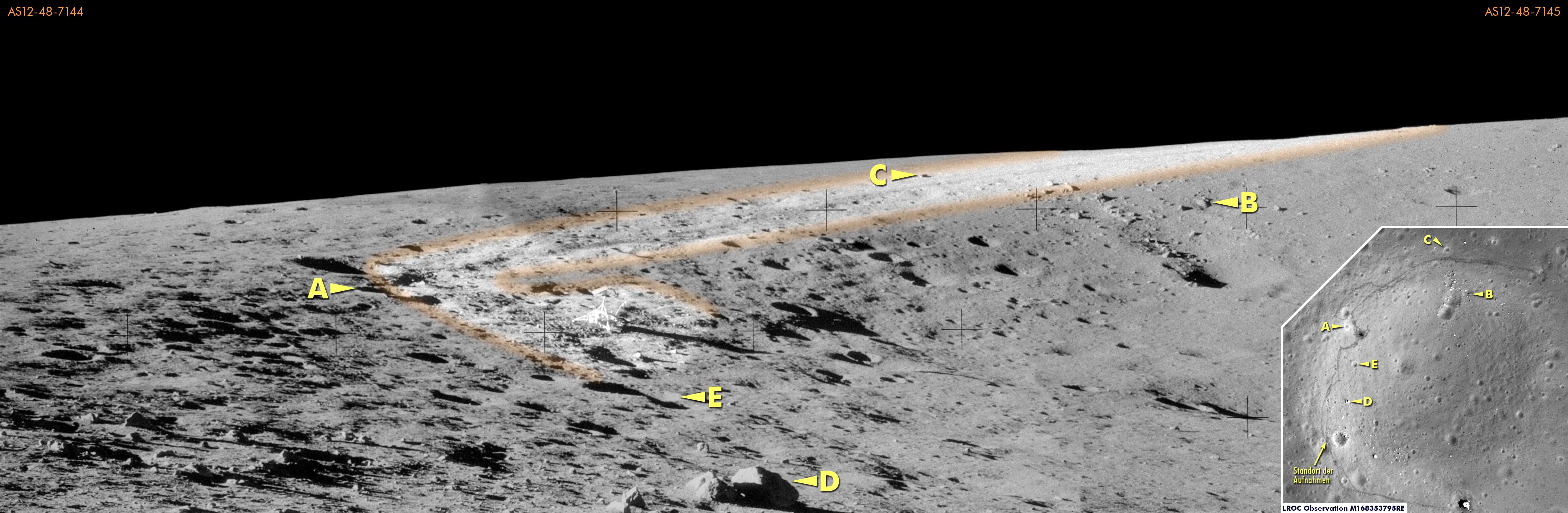 LMLunar Module bei Krater Block fotografiert. Darauf sind die Spuren zu erkennen, die sie auf ihrem Weg entlang des inneren Kraterhangs hinterlassen haben. Allerdings gibt es einige bogenförmige natürliche Strukturen, die mit den Fußspuren verwechselt werden können. Hier eine Zusammenstellung von AS12-48-7144 und AS12-48-7145 soweie eine bezeichnete Version kombiniert mit der LROC